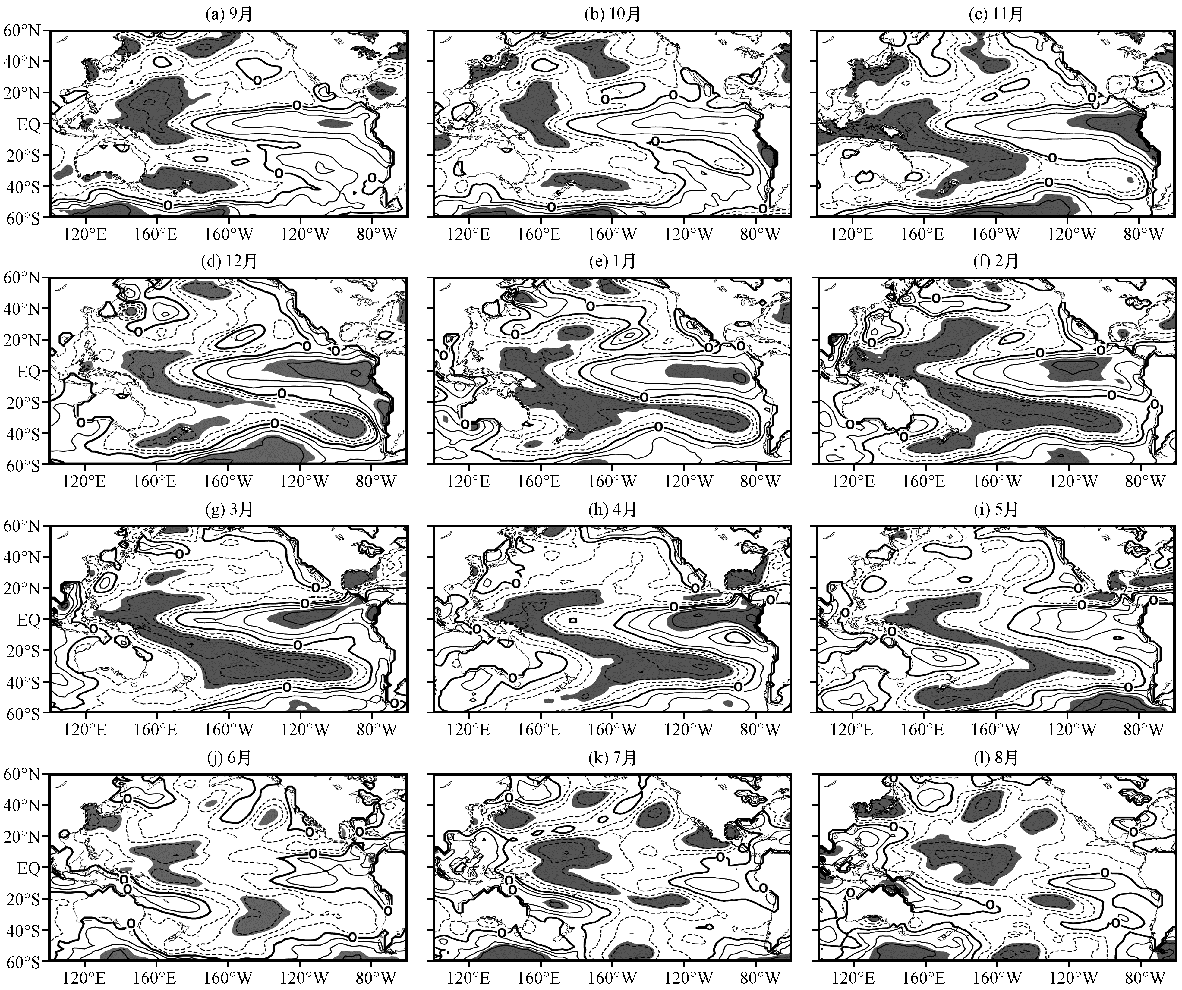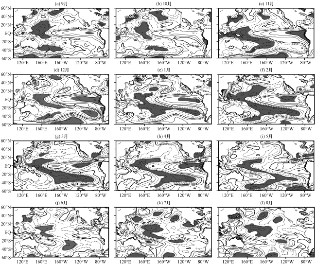 图2 1981 -2017年西南夏季降水第二模态PC系数与前一年9月至同年8月SST的相关场分布实线表示正相关, 虚线表示负相关, 加粗实线为0线, 阴影区域表示相关系数通过90%的显著性检验 Fig.2 The correlation coefficient fields between the second principle component (PC) of summer precipitation in the Southwest China and SST from pre-September to August during the period from 1981 to 2017.The solid and dotted line is for positive and negative correlation, respectively.The thick solid line is for zero and the shaded area is for correlation coefficient passing the 90% significant test |