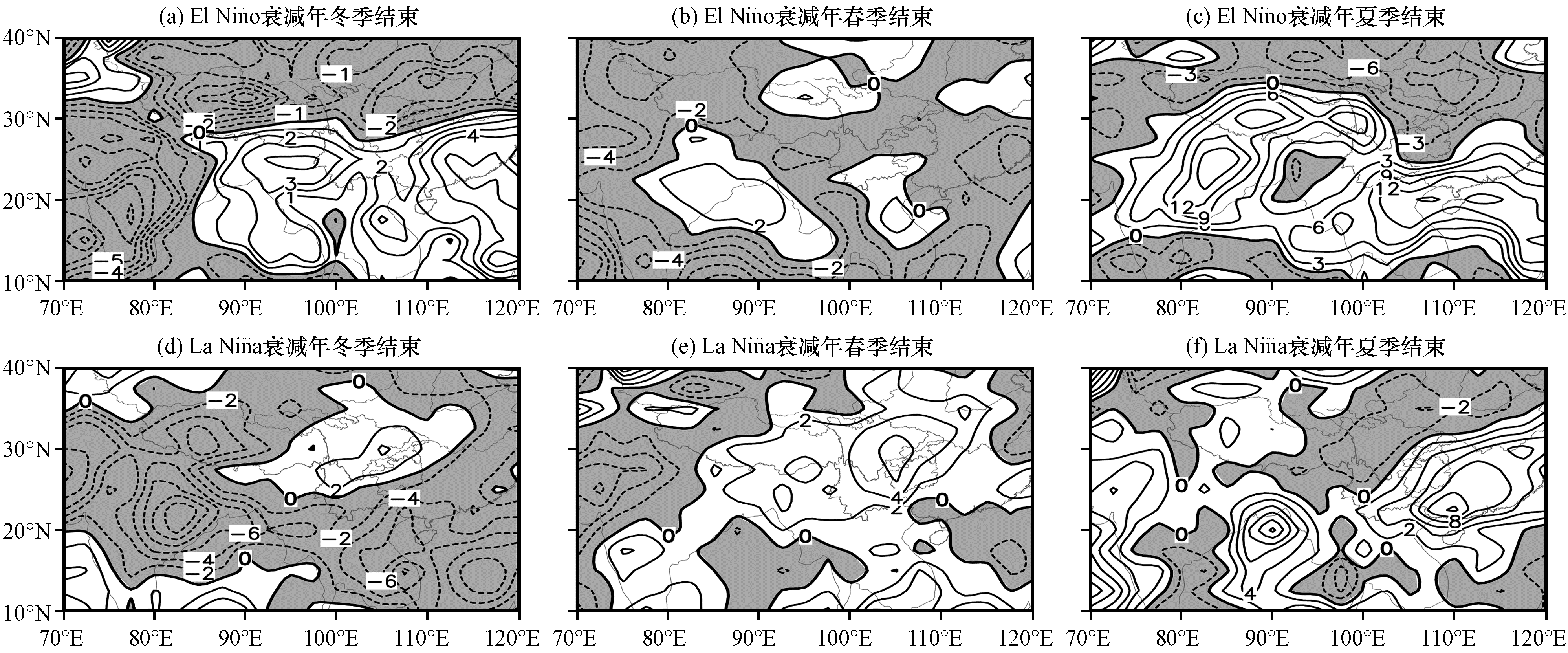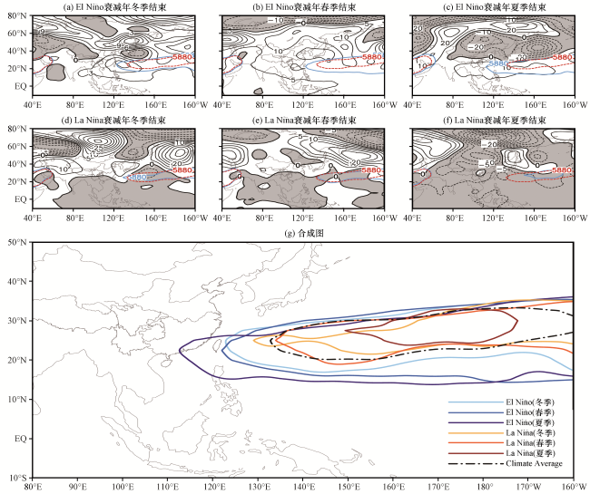图6 峰值在前冬的El Niño衰减年和La Niño衰减年分别在冬、 春和夏季结束的夏季500 hPa气候平均和副高5880 gpm等值线的合成图(a~f)中阴影为负值, 红线和蓝线分别为常年和挑选年的5880 gpm等值线 Fig.6 Summer geopotential height anomaly field over 500 hPa and the 5880 gpm line for WPSH in El Niño and La Niño decay year, ends in winter, spring, summer.The shaded area is for negative value, red and blue line are 5880 gpm lines in perennial and selected years, respectively |
