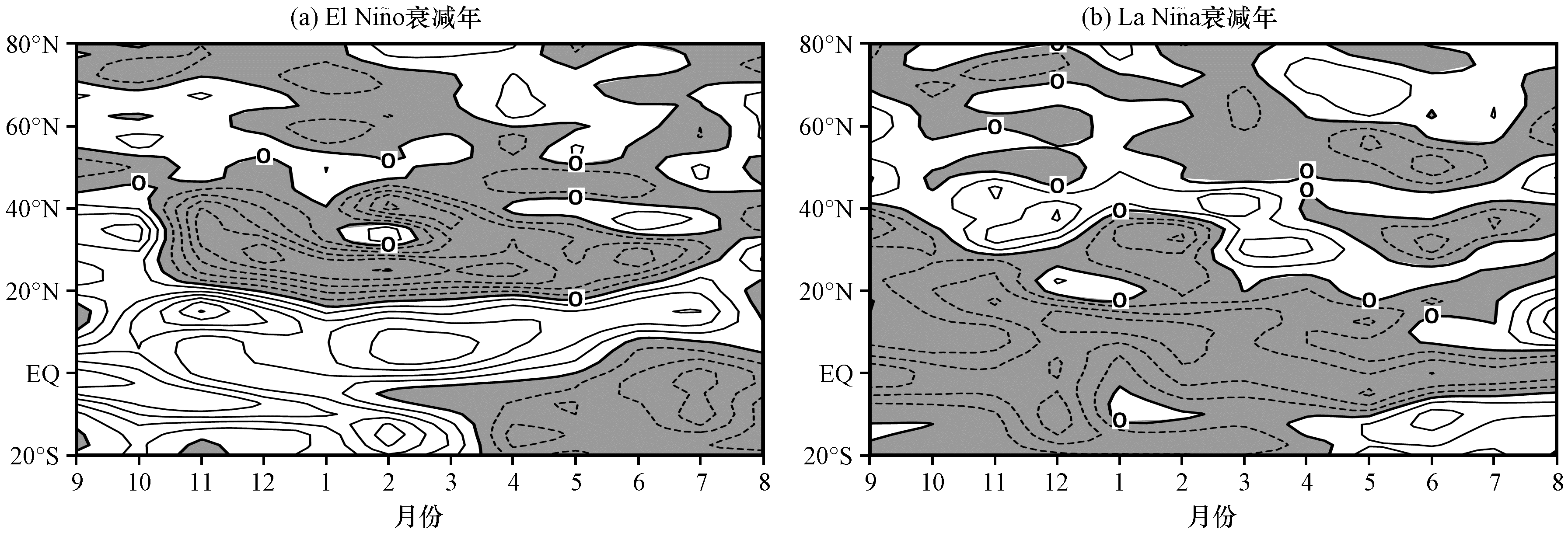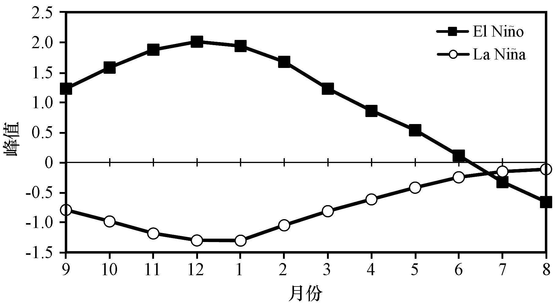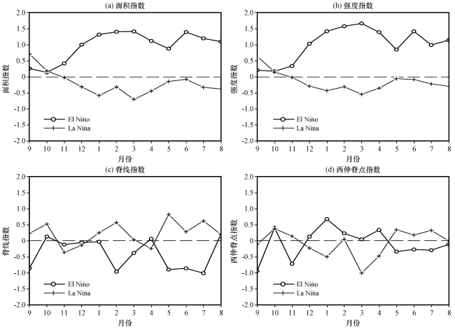 图9 峰值在前冬在春季和夏季结束的El Niño衰减年和La Niño衰减年的前一年9月到当年8月的Niño3.4指数合成图Fig.9 Anomaly of Niño 3.4 from pre-September to August in El Niño and La Niño decay year, which peaks in winter and ends in spring and summer |