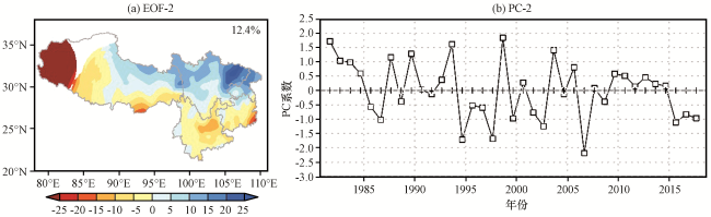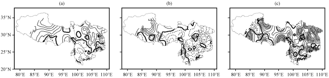 图4 El Niño衰减年(a)和La Niño衰减年(b)的西南夏季降水距平百分率合成值, 以及它们的差值T检验结果(c, 灰色区域为通过80%显著性检验)Fig.4 The summer precipitation anomaly of the Southwest China in the El Niño decay year (a), La Niño decay year (b) and their difference values with T test results (c, gray area represents passing 90% significance test) |