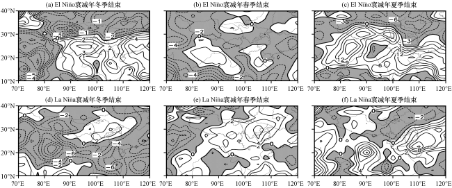 图8 峰值在前冬的El Niño衰减年和La Niño衰减年(次年)分别在冬、 春和夏季结束的OLR距平合成Fig.8 Summer anomaly field of outgoing long-wave radiation in El Niño and La Niño decay year, which peaks in winter and ends in winter, spring, summer |