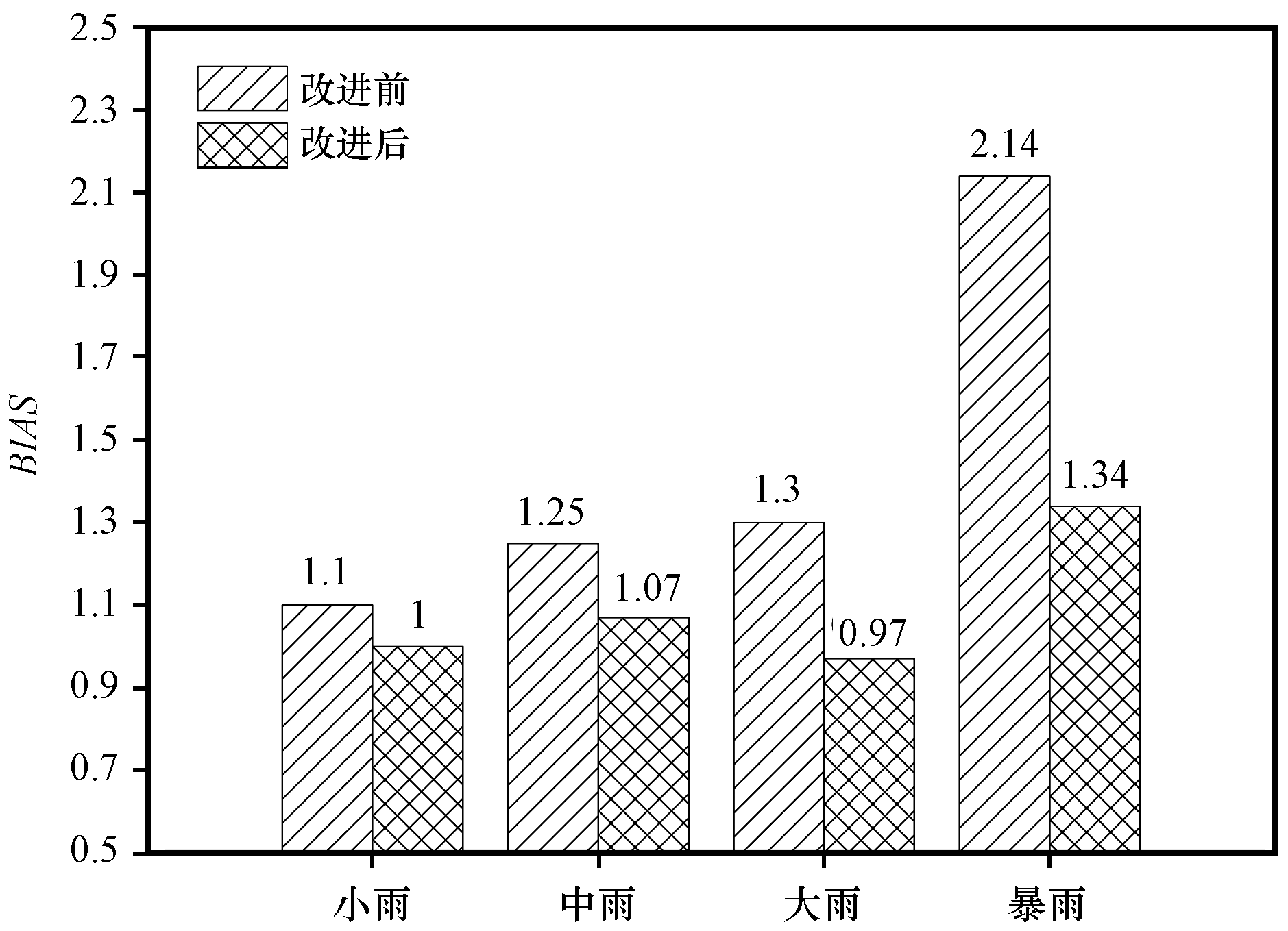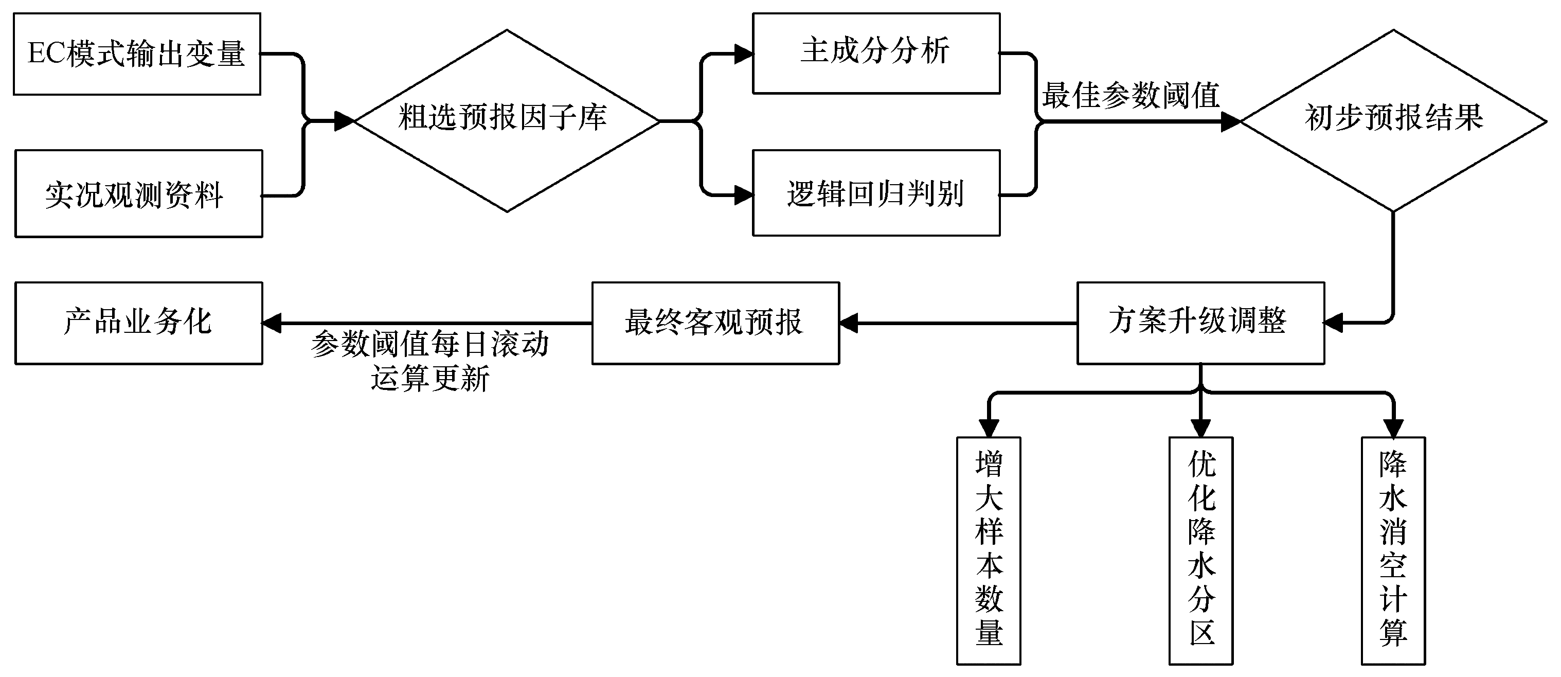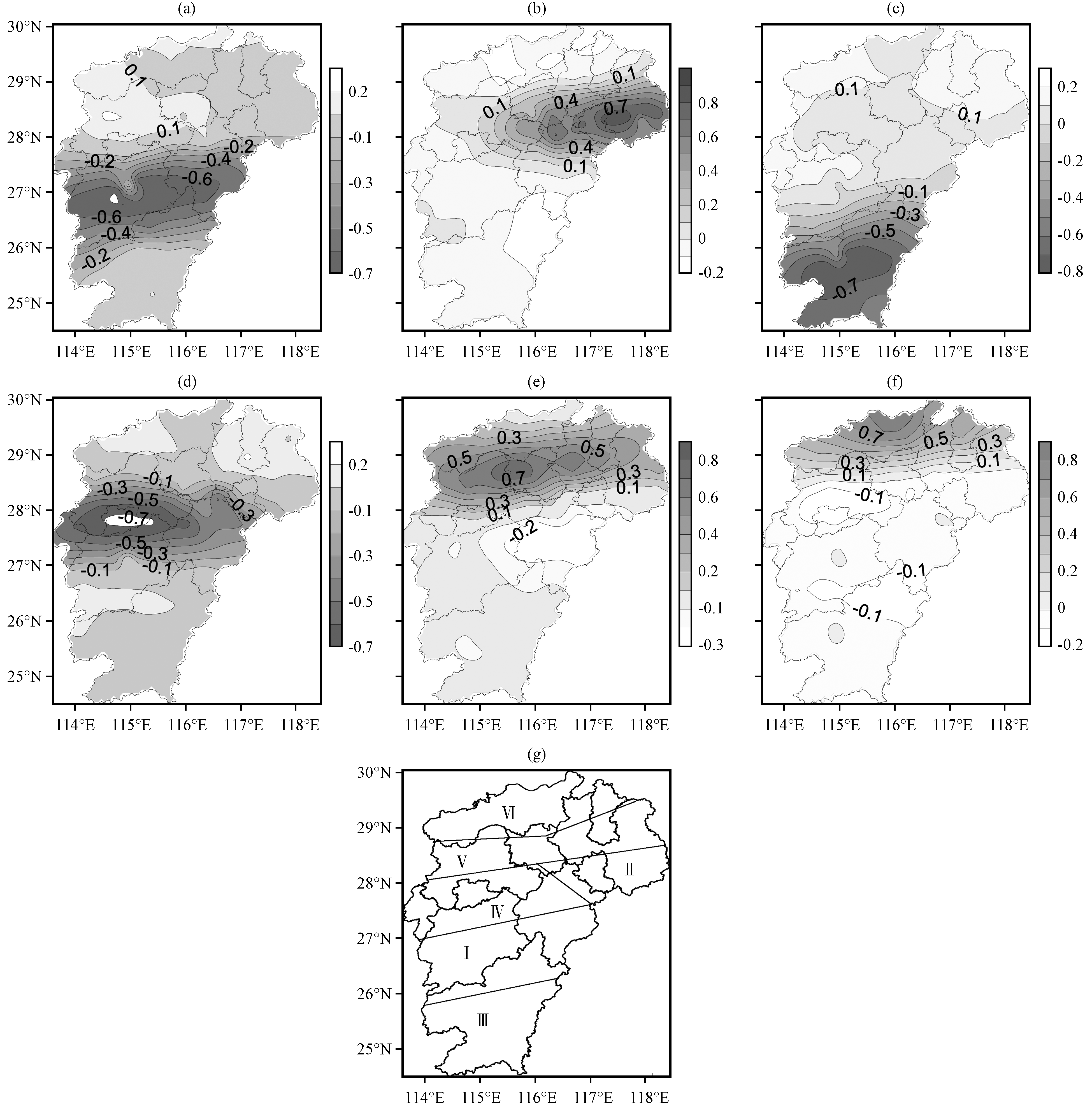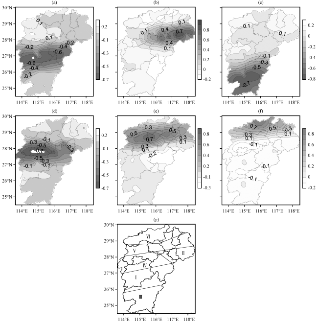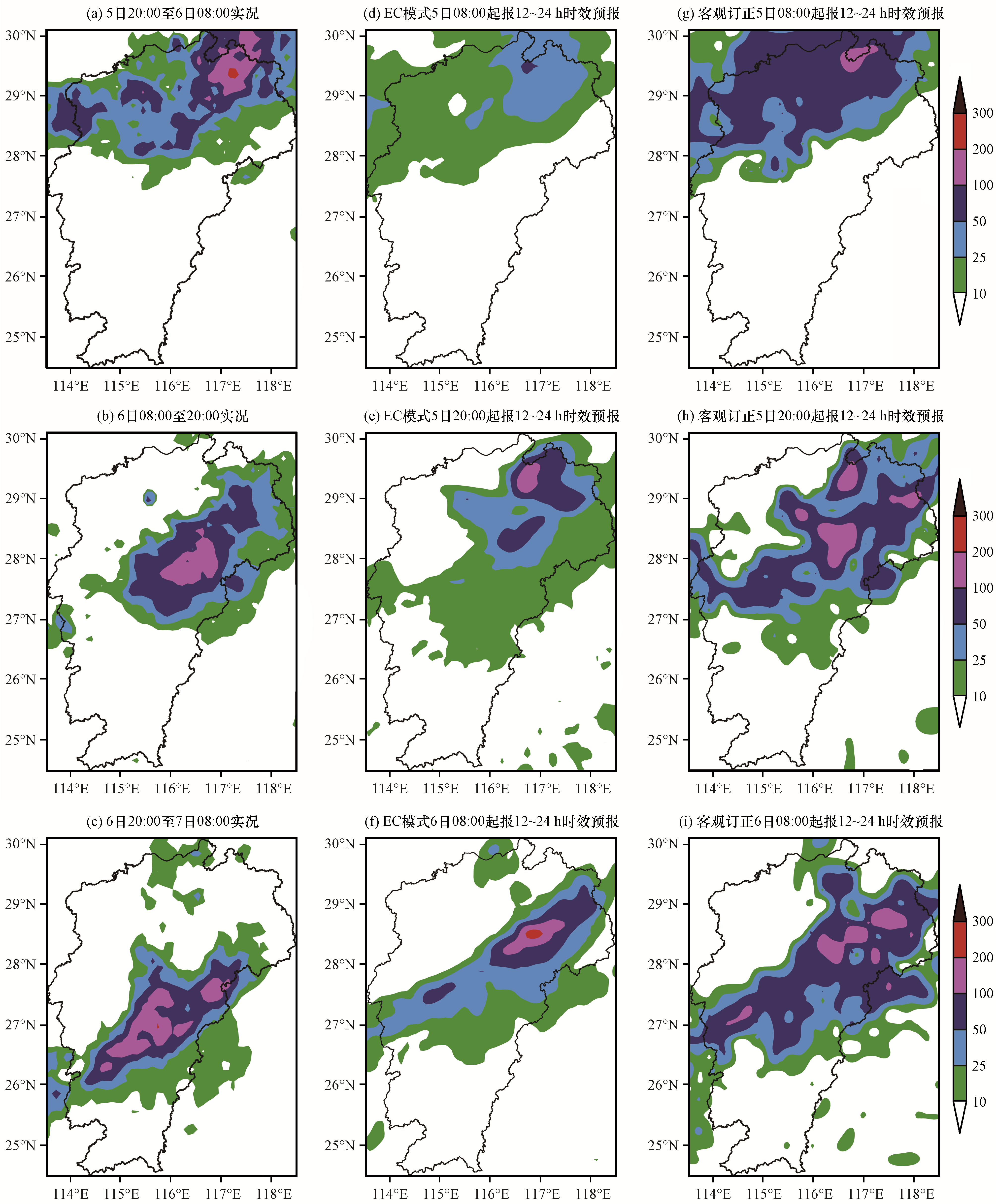 图5(c), (f), (i)], 数值模式过度预报了江西东北部的暴雨、 大暴雨, 降水中心较实况偏北100~200 km, 客观订正结果尽管同样过度预报了江西东北部的暴雨, 但是对26°N -28°N江西中部的暴雨较数值模式直接输出产品有更好的体现。由此可见, 基于本方案的预报结果虽然无法完全消除模式的系统性偏差, 但对在业务上具有较大的应用和参考价值, 可以显著提高预报质量。