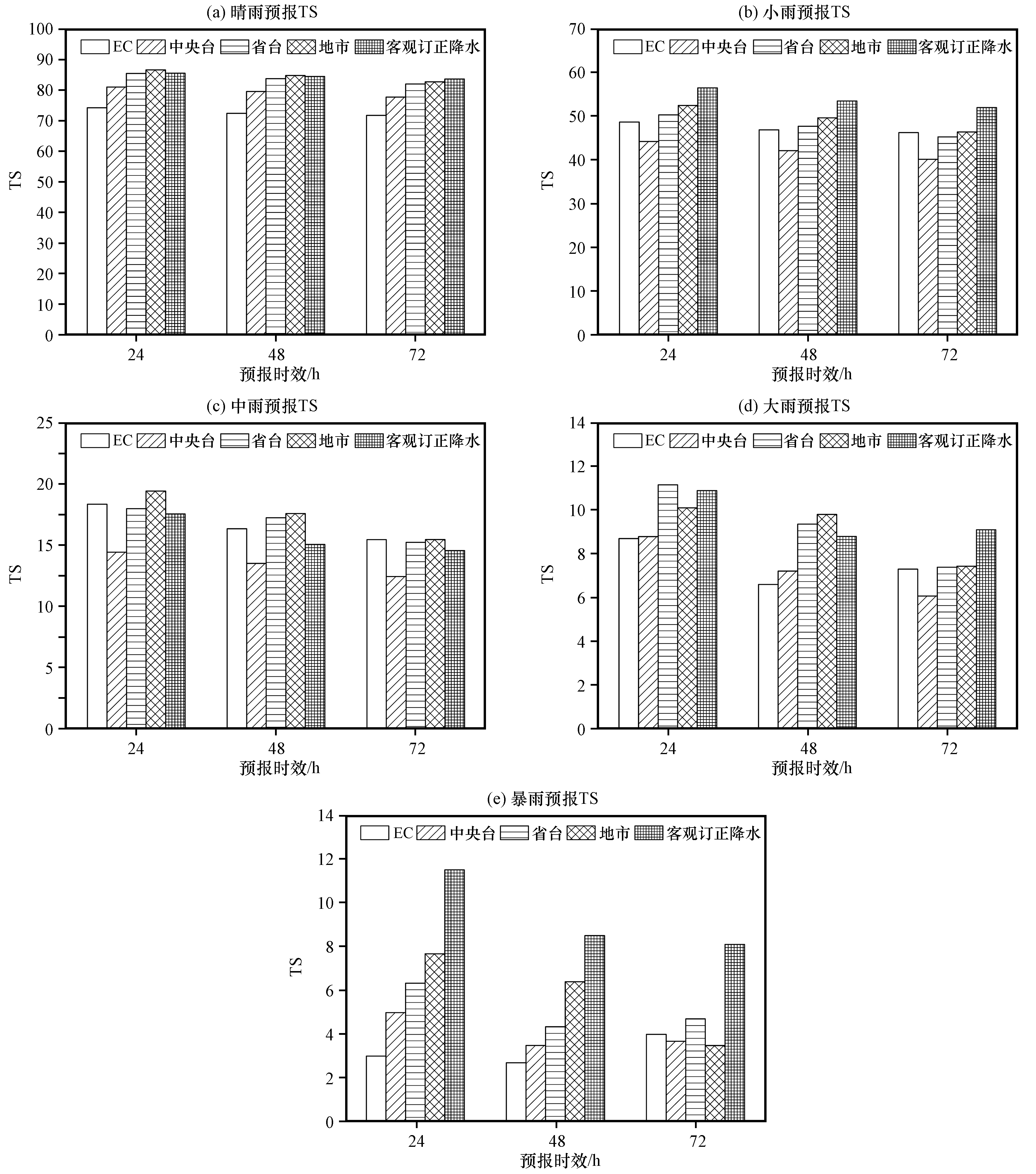 图5(d)], 模式输出降水对25 mm以上降水的范围预报明显偏小, 暴雨主体位于安徽南部, 暴雨落区较实况偏北100~200 km。相较而言, 客观订正降水预报表现了明显优势, 无论是雨带的形态、 位置、 量级均与实况更加接近, 赣北北部普遍预报了暴雨, 赣东北最大降水中心超过100 mm[