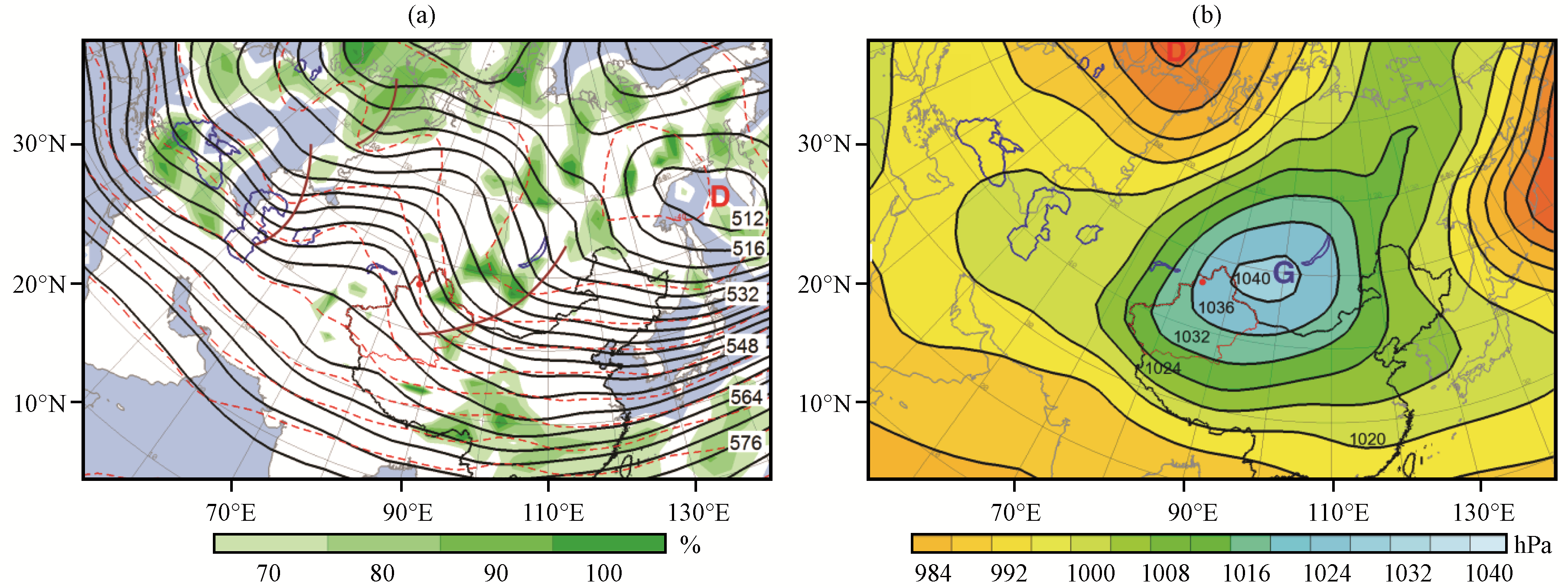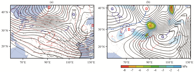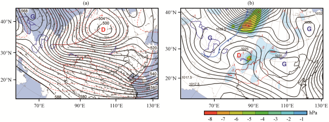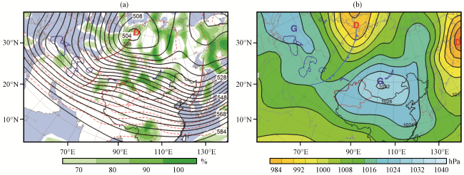 图2 2015 -2018年玛依塔斯9场回流型东风吹雪时500 hPa平均合成位势高度场(a, 黑色等值线, 单位: dagpm)和地面平均合成气压场(b, 等值线和彩色区, 单位: hPa)(a)红虚线为500 hPa温度场(单位: ℃), 绿色阴影为850 hPa相对湿度场(单位: %), 棕色短实线为槽线, “D”表示位势高度“低中心”; (b)“D”和 “G”表示“低压中心”和“高压中心”; 深蓝色实线为海域边界, 红色“·”为玛依塔斯交通气象站位置 Fig.2 The 500 hPa average synthetic geopotential height field (a, black contour, unit: dagpm) and the ground average synthetic pressure field (b, contour and color area, unit: hPa ) when the 9 recirculation easterly winds blow snow in Mayitas from 2015 to 2018.The red dotted line is the 500 hPa temperature field (unit: ℃), the green shade is the 850 hPa relative humidity field (Unit: %), the brown short solid line is the trough line, "D" represents the "low center" of the geopotential height in Fig.2 (a)."D" and "G" indicate "low pressure center" and "high pressure center" in Fig.2(b).The dark blue solid line is the sea area boundary, and the red "·" is the location of the Mayitas Traffic Weather Station |