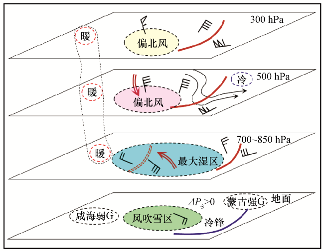 图7 玛依塔斯“回流型”东风吹雪时的高低空天气系统配置及三维空间模型棕色实线为高空槽线, 风羽示意风向及风速, 黑色带箭头实线为500 hPa等位势高度线, 棕色带箭头双实线为风速大值区, 棕色双虚线为低层切变线, “暖”和“冷”代表“暖中心”和“冷中心”, “G”代表地面高压中心, 蓝色实线为地面冷锋 Fig.7 High and low altitude weather system configuration and three-dimensional space model of Mayitas "return type" east wi-nd blowing snow.The brown solid line is the high-altitude trou-gh line, the wind plume indicates the wind direction and wind speed, the black solid line with an arrow is the 500 hPa equipotential height line, the brown doubled solid line with arrow is the area of large wind speed, and the brown double dashed line is the low-level shear line."Warm" and "cold" represent "warm center" and "cold center", "G" represents the ground high-voltage center, and the solid blue line is the ground cold front |