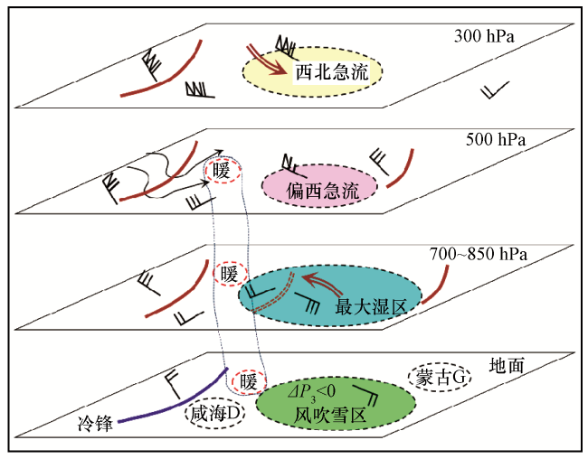 图8 玛依塔斯“锋前减压型”东风吹雪时的高低空天气系统配置和三维空间模型棕色实线为高空槽线, 风羽示意风向及风速, 黑色带箭头实线为500 hPa等高线, 棕色带箭头双实线为风速大值区, 棕色双虚线为低层切变线, “暖”和“冷”代表“暖中心”和“冷中心”, “G”和“D”代表地面“高压中心”和“低压中心”, 蓝色实线为地面冷锋 Fig.8 The high and low altitude weather system configuration and three-dimensional space model of Mayitas "forward decompression type" when the east wind blows snow.The brown solid line is the high-altitude trough line, the wind plume indicates the wind direction and wind speed, the black solid line with an arrow is the 500 hPa equipotential height line, the brown doubled solid line with arrow is the area of large wind speed, and the brown double dashed line is the low-level shear line."Warm" and "cold" represent "warm center" and "cold center", "G" represents the ground high-voltage center, and the solid blue line is the ground cold front |
