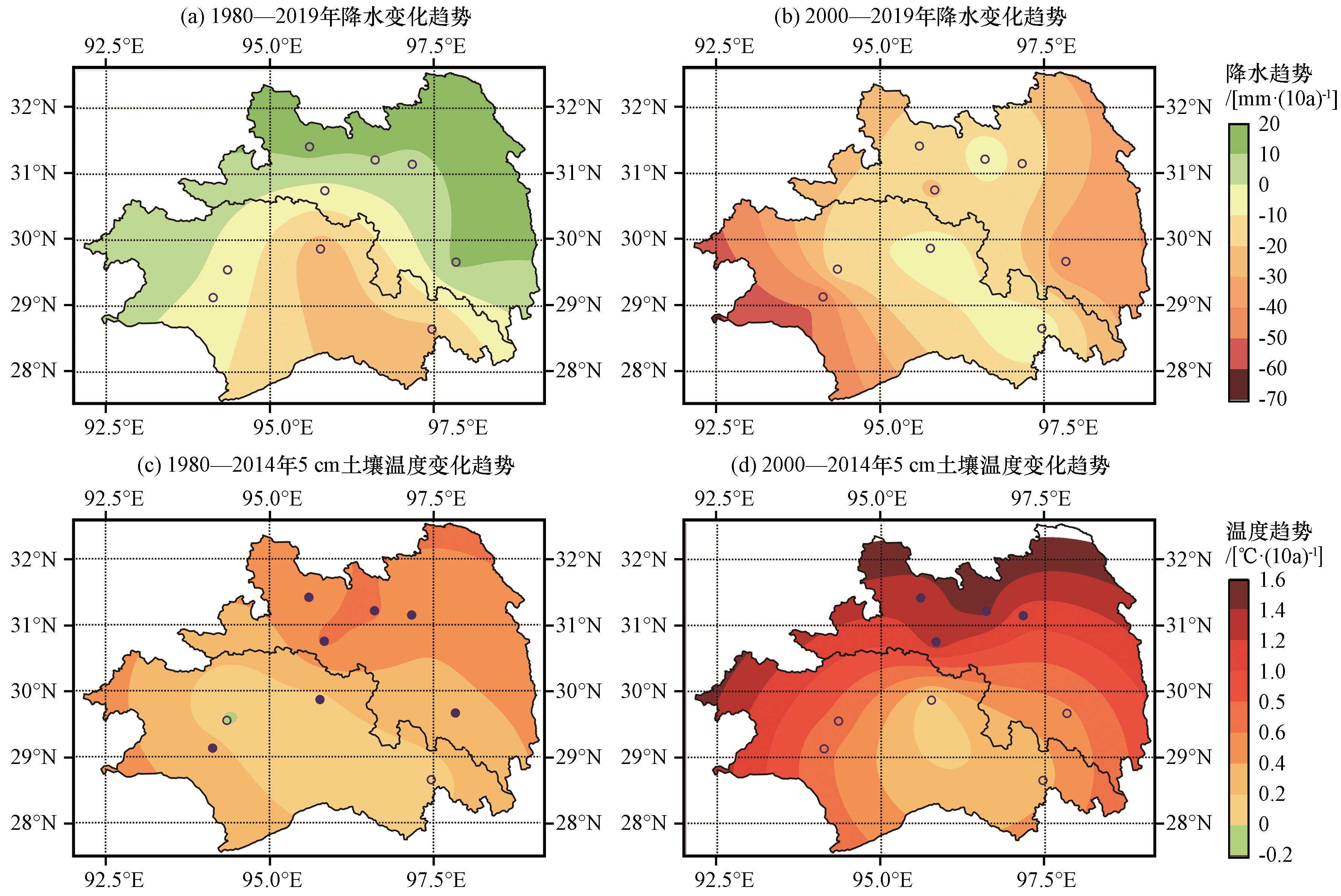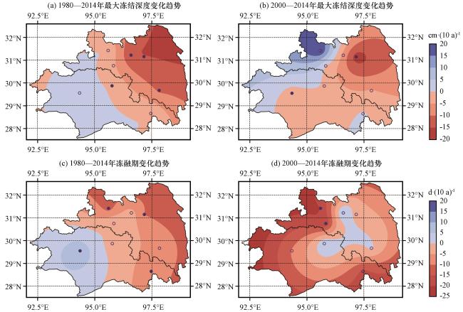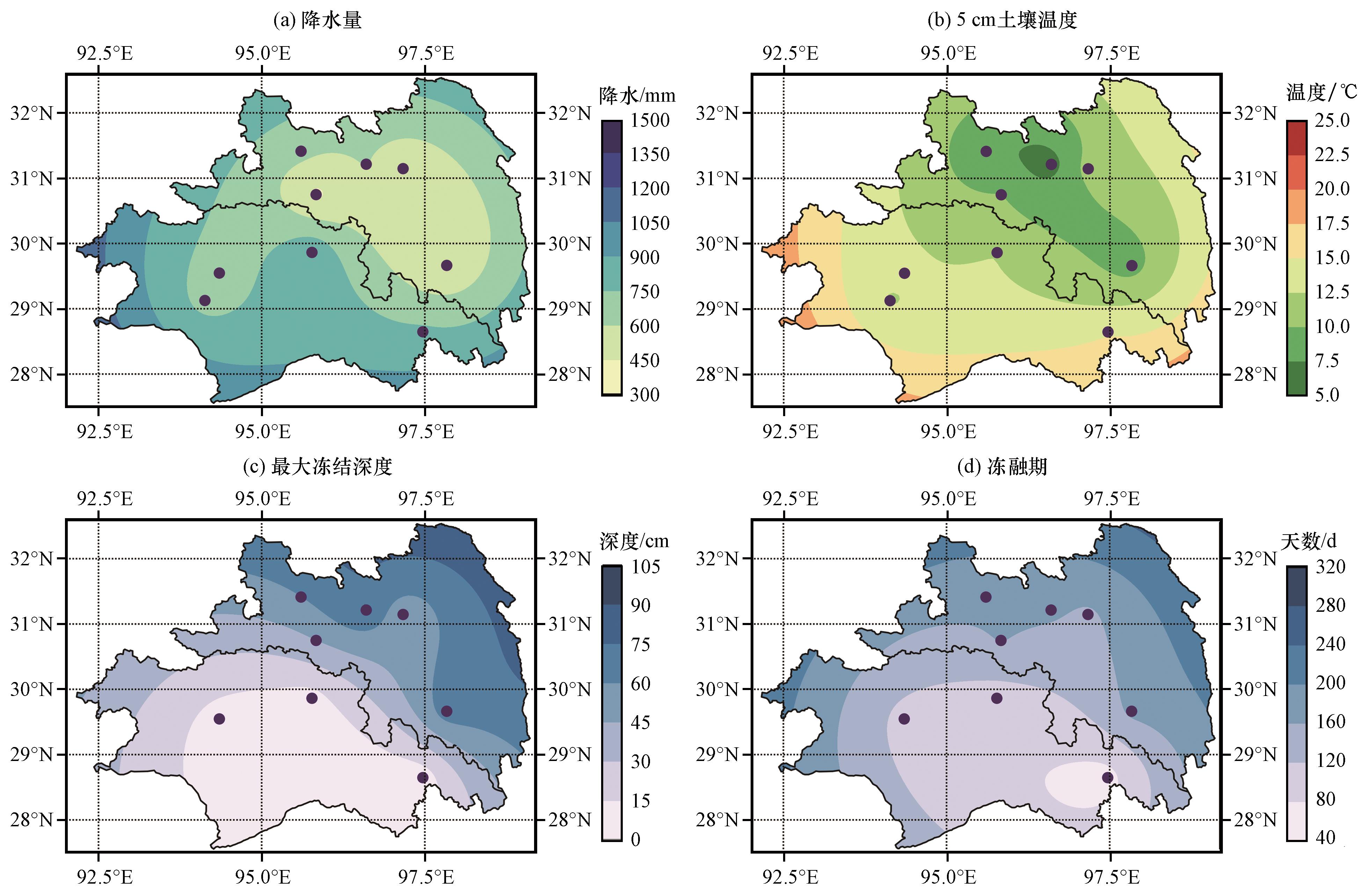 图2 1980 -2014年藏东南降水(单位: mm)、 5 cm土壤温度(单位: ℃)、 最大冻结深度(单位: mm)、 冻融期(单位: d)空间分布圆点表示气象站点 Fig.2 Spatial distribution of precipitation (unit: mm), 5-cm soil temperature (unit: ℃), maximum frozen depth (unit: mm), and freeze-thaw period (unit: d) in Southeastern Xizang from 1980 to 2014.The dots indicate weather stations |