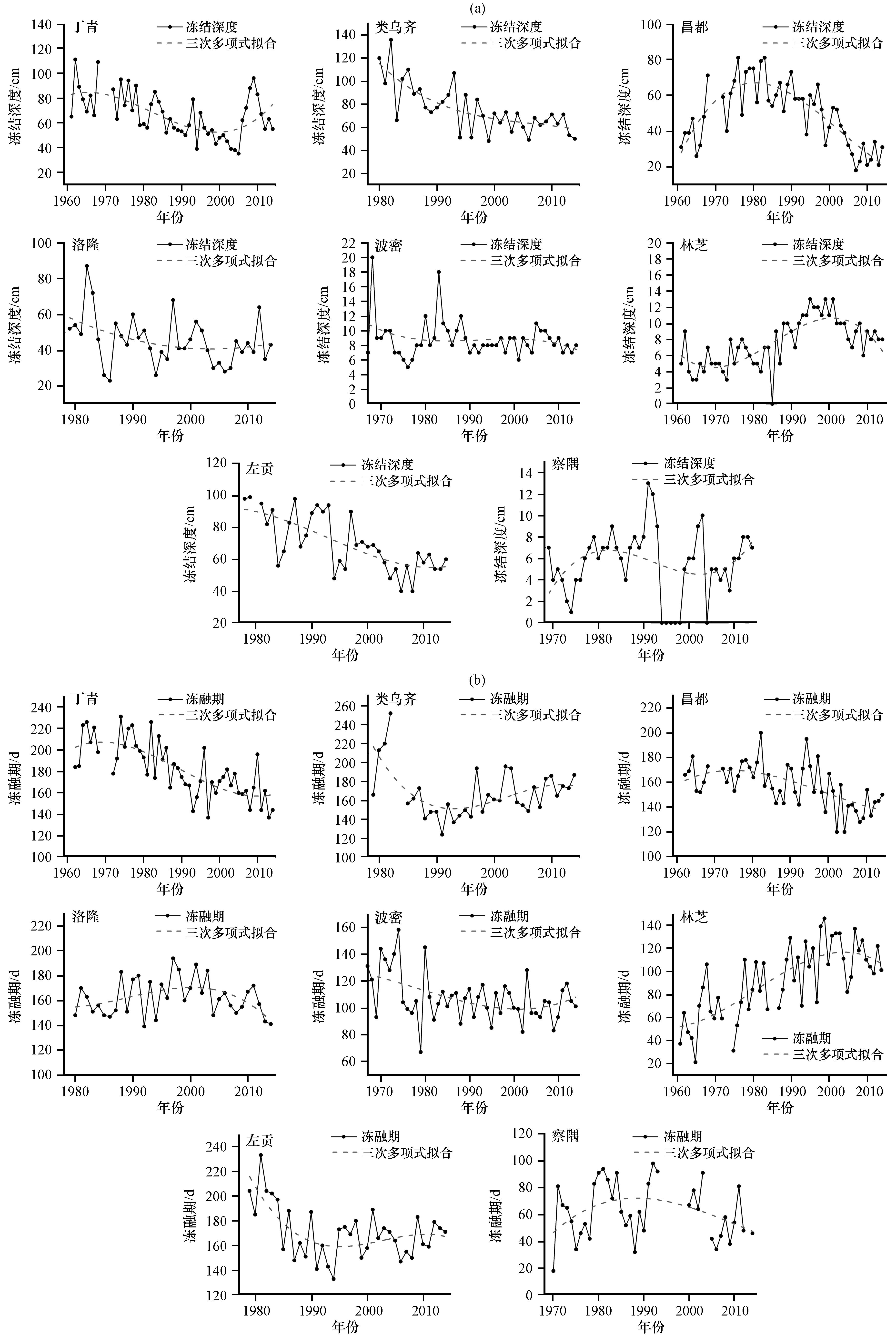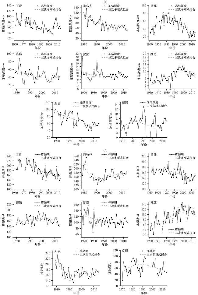 图4 藏东南站点最大冻结深度(a)、 冻融期(b)年际变化Fig.4 Change of annual maximum frozen depth (a) and freeze-thaw period (b) in southeastern Xizang |