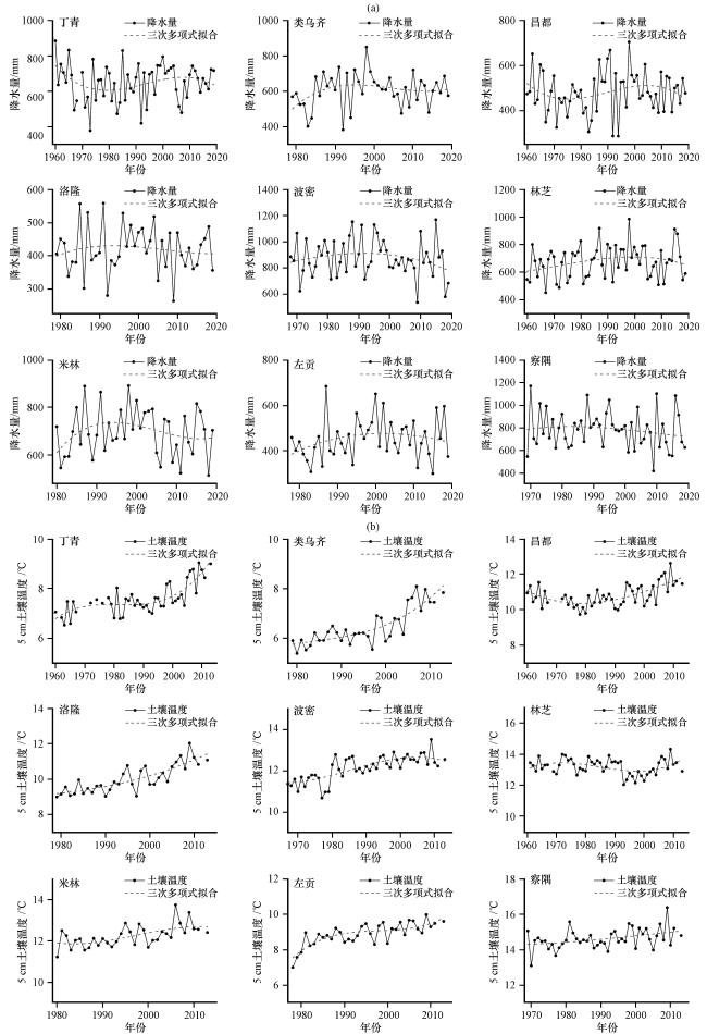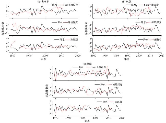 图8 典型站点年降水与土壤温度和冻融的关系Fig.8 Correlation of precipitation with soil temperature and freezing and thawing at typical sites |