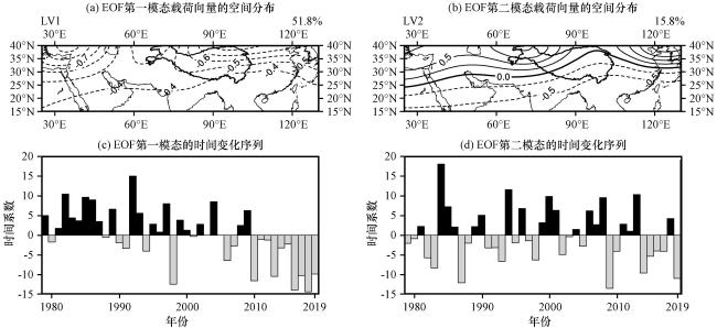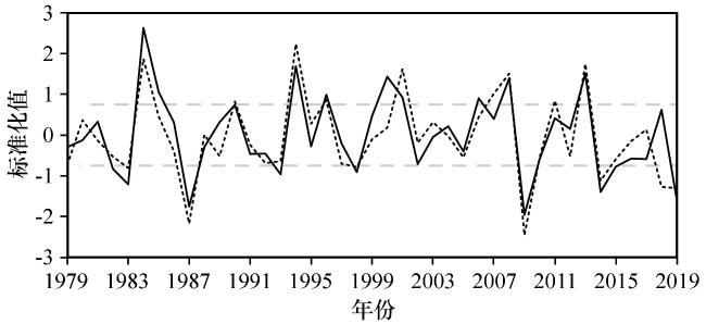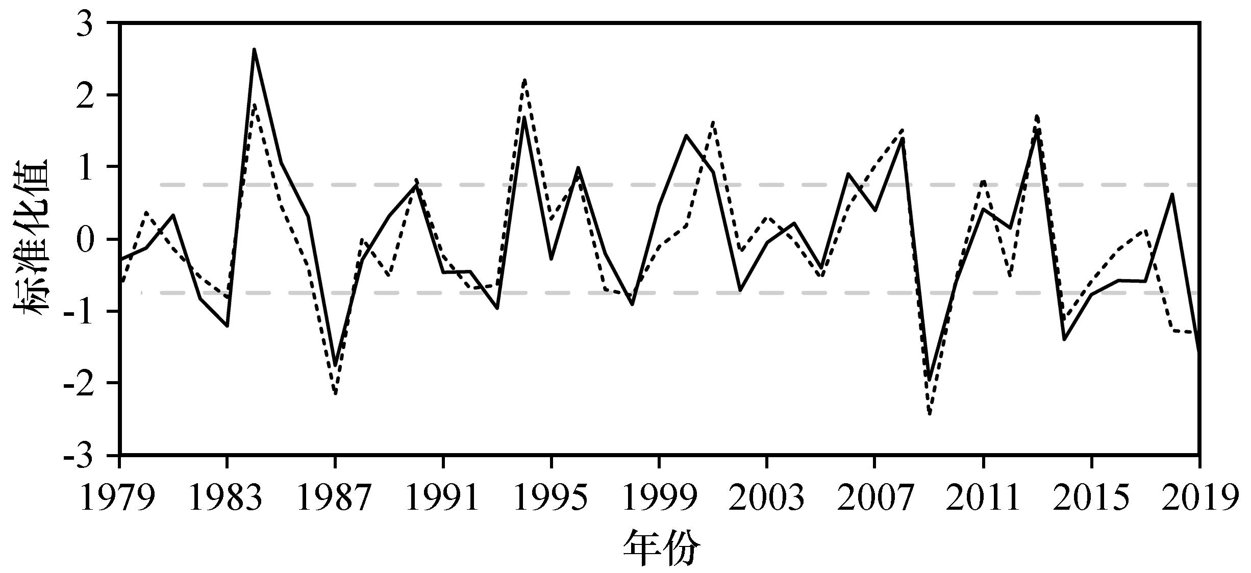 图2 1979 -2019年200 hPa位势高度场EOF第二模态时间序列的标准化序列(黑色实线)和南亚高压位置变化指数(黑色虚线, 引自Wei et al, 2015)The dotted gray line represents 0.75 Fig.2 Normalized time series of PC2 for 200 hPa geopotential height from 1979 to 2019 (solid black line) and position index of South Asian High (SAH) at inter-annual scale (dashed black line, from Wei et al, 2015). |