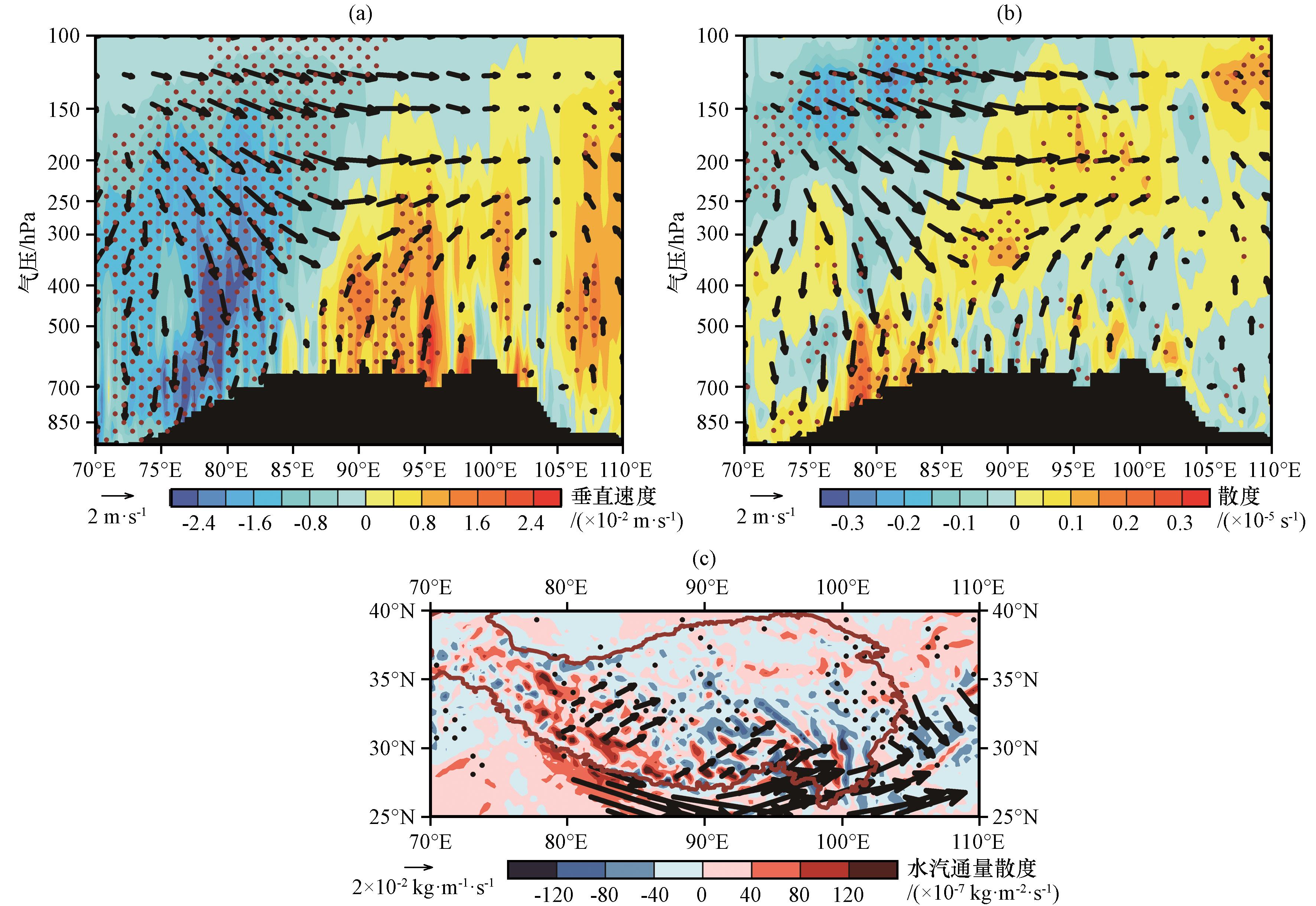 图4 南亚高压位置偏东南年份与偏西北年份(偏东南-偏西北)对应的25°N -35°N平均的垂直速度(a, 彩色区, 单位: 10-2 m·s-1), 散度(b, 彩色区, 单位: 10-5 s-1), 高原及其周边地区850~300 hPa积分水汽通量(矢量, 单位: 102 kg·m-1·s-1)及其散度(彩色区, 单位: 10-7 kg·m-2·s-1)的差异(c)The vectors in Fig.4(a)~(b) represent the difference of horizontal wind speed.The dotted area in (a)~(c) represents that the difference passes the significance test of 0.05, the vector in Fig.4(c) denotes that the difference passes the significance test of 0.05 Fig.4 Height vs.longitude cross-section of the mean vertical velocity (a, color area, unit: 10-2 m·s-1), the mean divergence (b, color area, unit: 10-5 s-1) for the region of 25°N -35°N, and the spatial distribution of integrated water vapor flux from 850 hPa to 300 hPa ( 102 kg·m-1·s-1) and its divergence (color area, unit: 10-7 kg·m-2·s-1) (c) over the Qinghai-Xizang Plateau and its surrounding areas, corresponding to the differences between the anomaly of South Asia High position (southeast minus northwest). |