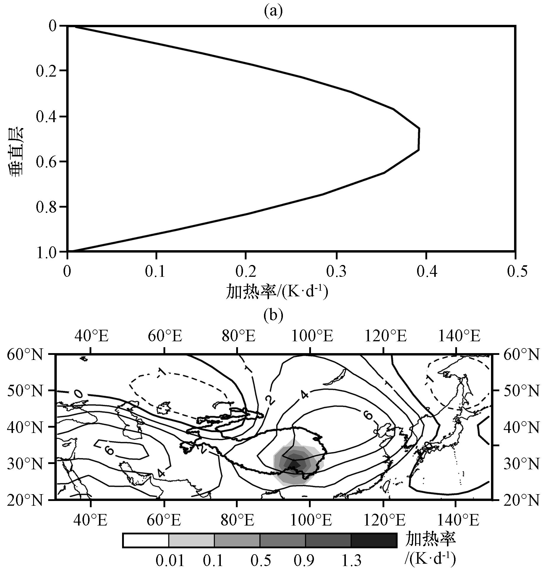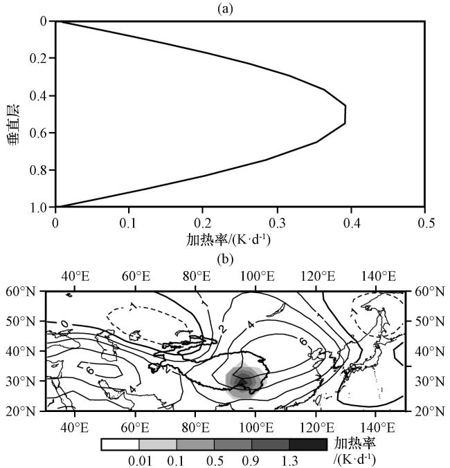 图6 敏感性试验中高原东部大气加热廓线的垂直分布(a), 200 hPa位势高度异常(等值线, 间隔分别为-1.0、 0.0、 1.0、 2.0、 4.0、 6.0, 单位: m)及 层的大气异常加热(阴影, 单位: K·d-1)的水平分布(b)Fig.6 The vertical distribution of atmospheric heating profiles on the eastern Qinghai-Xizang Plateau (a), the spatial distribution of geopotential height anomaly at 200 hPa (contours with intervals of -1.0, 0.0, 1.0, 2.0, 4.0, and 6.0, respectively.Unit: m) and horizontal atmospheric heating (the shaded, unit: K·d-1) at in the sensitivity experiment (b) |