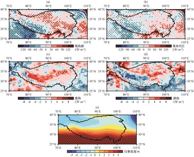 图5 南亚高压位置偏东南年份与偏西北年份(偏东南-偏西北)对应的高原及其周边地区整层视热源<Q 1 >(a, 单位: W·m-2)、 整层视水汽汇<Q 2 >(b, 单位: W·m-2)、 高原地表感热(c, 单位: W·m-2)、 高原地表潜热(d, 单位: W·m-2)及高原500 hPa位势高度(e, 单位: m)的差异打点区域表示差值通过了0.05的显著性检验 Fig.5 Spatial distribution of vertically integrated apparent heat source<Q 1 > (a, unit: W·m-2), vertically integrated apparent moisture sink <Q 2 > (b, unit: W·m-2), surface sensible heat flux (c, unit: W·m-2), surface latent heat flux (d, unit: W·m-2), and geopotential height at 500 hPa (e, unit: m) over the Qinghai-Xizang Plateau and its surrounding areas, results are corresponding to the differences between the anomaly of South Asia High position (southeast minus northwest). The dotted area represents that the difference passes the significance test of 0.05 |