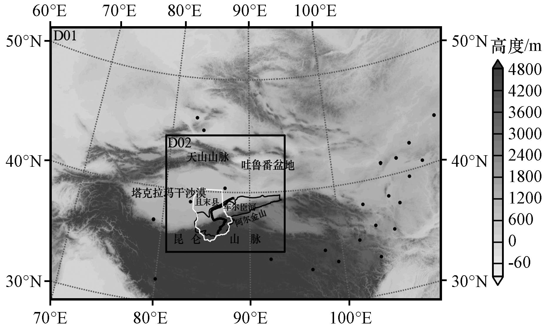 图2 WRF双层模拟区域内地形高度及地面气象站分布黑点表示模拟范围内的地面气象站, 黑色粗线条为车尔臣河, 白色线条包围区域为且末县, 黑色细线条包围区域为车尔臣河流域 Fig.2 The terrain height of the WRF double-layer simulated area and the distribution map of surface weather stations in China.The black dots in the figure represent the Chinese surface weather stations within the simulated range, with the black thick line being the Cherchen River, the white line surrounding the area being Jimo County, and the black thin line surrounding the area being the Cherchen River Basin |