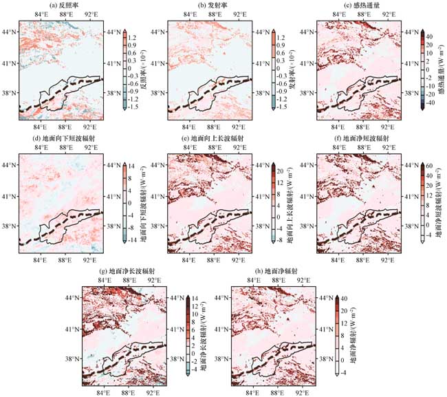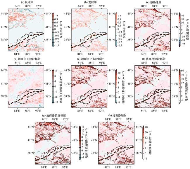 图6 实验21和实验01模拟结果差异(a)反照率, (b)发射率, (c)感热通量(单位: W·m-2), (d)地面向下短波辐射(单位: W·m-2), (e)地面向上长波辐射(单位: W·m-2), (f)地面净短波辐射(单位: W·m-2), (g)地面净长波辐射(向上长波–向下长波)(单位: W·m-2), (h)地面净辐射(单位: W·m-2) Fig.6 Differences between the simulation results of Experiment 21 and Experiment 01.(a) albedo, (b) emissivity, (c) Sensible heat flux (unit: W·m-2), (d) Ground downward shortwave radiation (unit: W·m-2), (e) Ground upward longwave radiation (unit: W·m-2), (f) Ground net shortwave radiation (unit: W·m-2), (g) Ground net longwave radiation (upward longwave-downward longwave) (unit: W·m-2), (h) Ground net radiation (unit: W·m-2) |