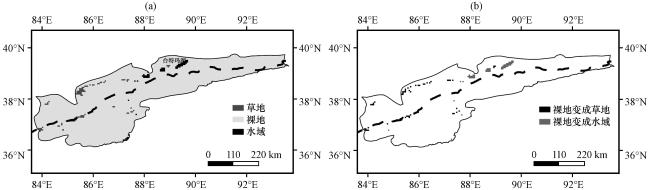 图1 车尔臣河流域2001年土地利用类型分布(a)及自2001 -2021年土地利用类型变化分布(b)水域增加区域为台特玛湖(图中黑色虚线为2000 m等高线, 以下图4~6中相同) Fig.1 Distribution of land use types in the Cherchen River Basin in 2001 (a) and Distribution of land use types change from 2001 to 2021 in the Cherchen River Basin (b).The area of water increase is Lake Taitema.The black dotted line in the figure is the 2000 m contour line, the same as in Fig.4~6 below |