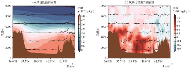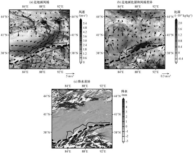 图4 D02模拟范围内近地面风场分布(a)、 实验21和实验01近地面比湿和风场差异(b)及地面夏季降水差异(c)Fig.4 Distribution of near-surface wind field in the simulated range of D02 (a), Differences in near-surface specific humidity and wind field (b) and Differences in surface summer precipitation (c) in Experiment 21 and Experiment 01 |