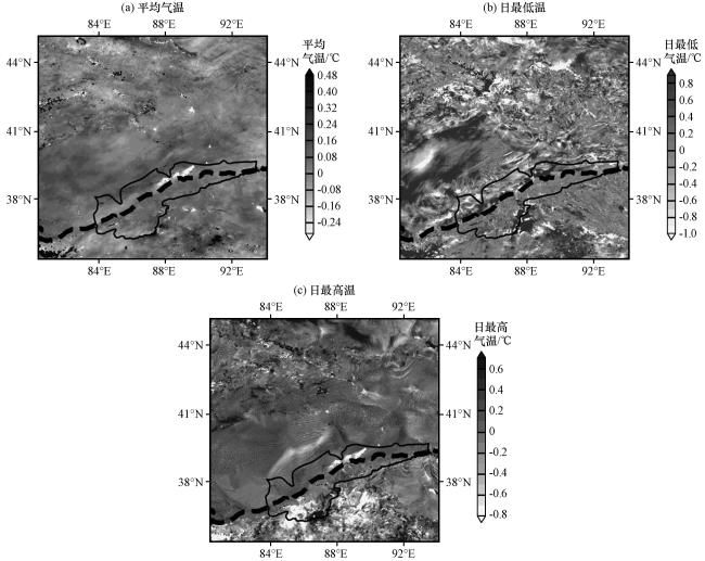 图5 实验21和实验01模拟的车尔臣河流域2021年7月地面2 m气温差异(a)平均气温, (b)日最低温, (c)日最高温 Fig.5 Experiment 21 and Experiment 01 simulated the difference of 2 m ground temperature in July 2021 in the Cherchen River Basin.(a) mean temperature, (b) daily minimum temperature, (c) daily maximum temperature |
