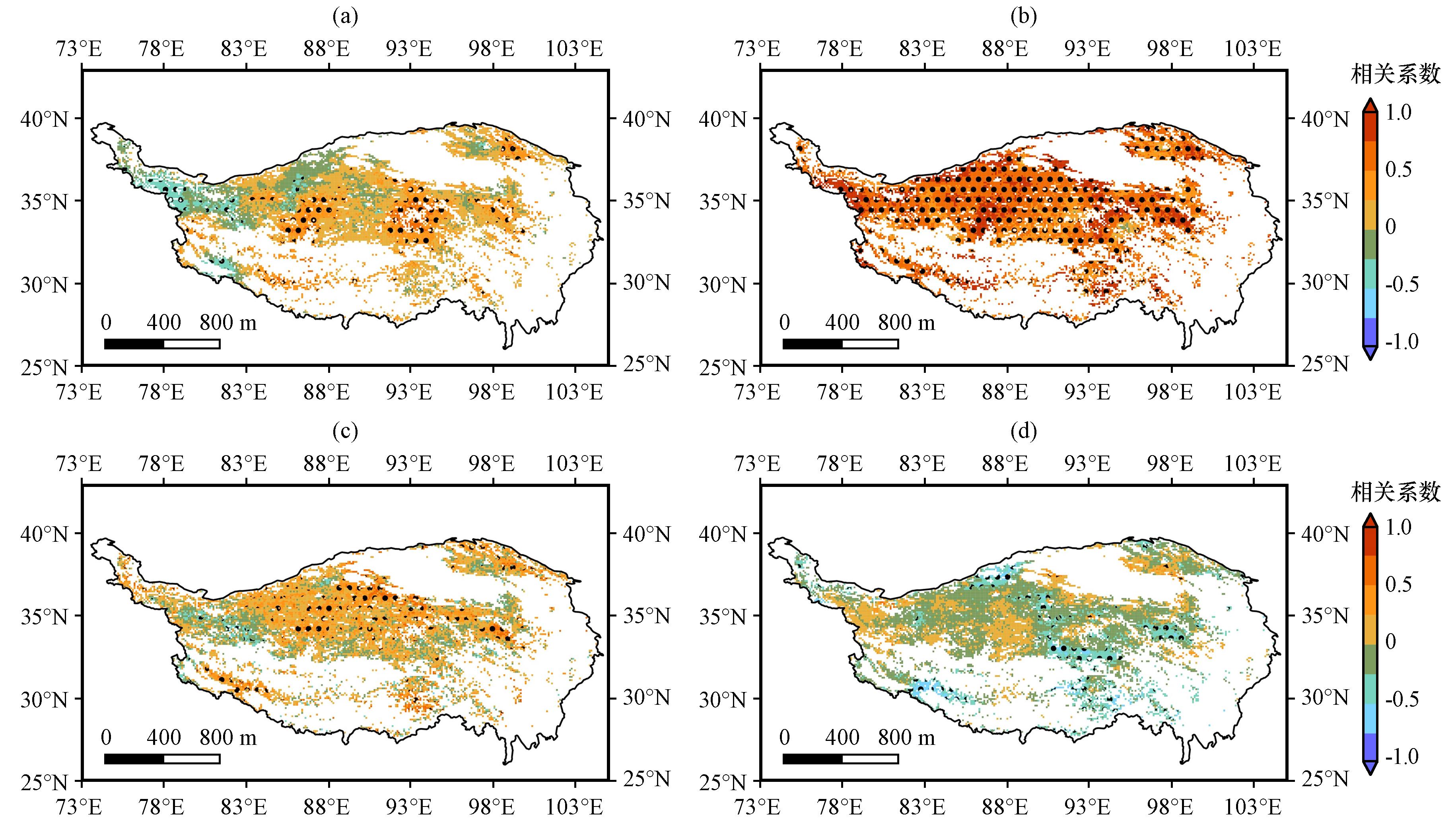 图6 1980 -2017年高原多年冻土区降水量(a)、 近地表温度(b)、 植被指数(1982 -2015年)(c)、 积雪厚度(d)与融化持续时间相关系数分布打点区为通过 90%信度检验 Fig.6 Distribution of correlation coefficients between thaw duration and precipitation (a), near-surface temperature (b), vegetation index (1982 -2015) (c), and snow depth (d) in the plateau permafrost region from 1980 to 2017.Dotted areas indicate regions that passed the 90% confidence level test |