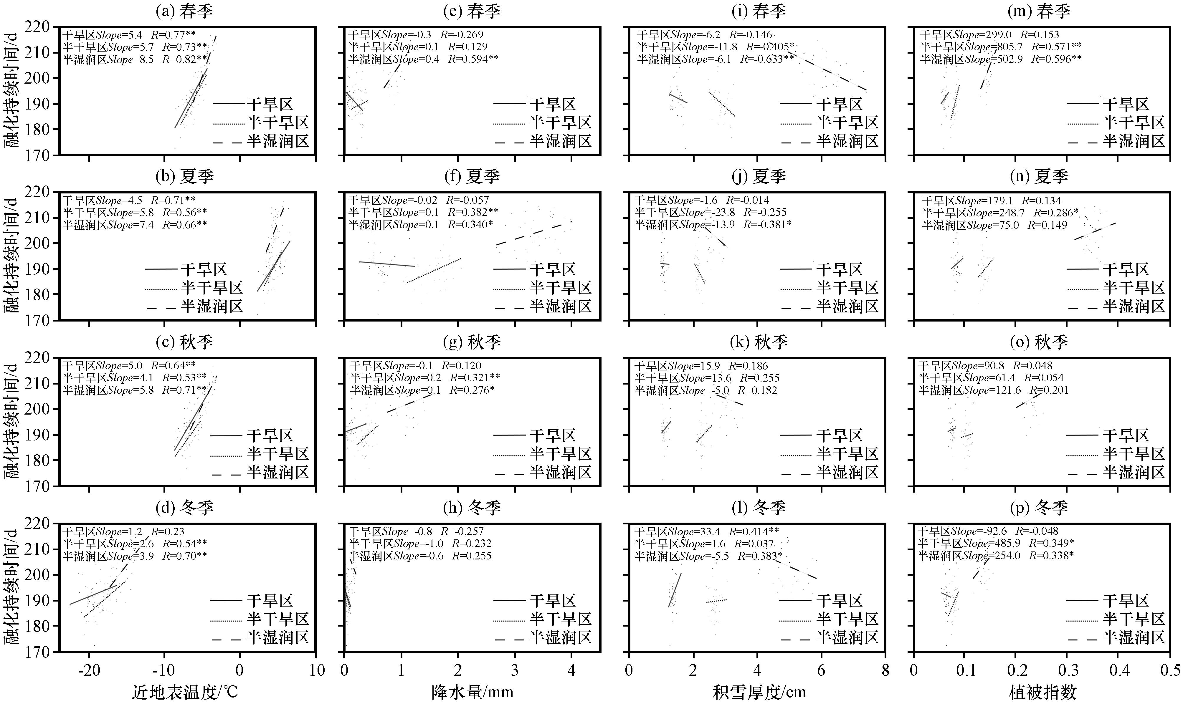 图8 1980 -2017年高原多年冻土区域不同季节和气候区融化持续时间与近地表温度(a~d)、 降水量(e~h)、 积雪厚度(i~l)、 植被指数(m~p)的相关性分析Fig.8 Correlation analysis between thaw duration and near-surface temperature (a~d), precipitation (e~h), snow depth (i~l), and vegetation index (m~p) in different seasons and climatic regions of the plateau permafrost area from 1980 to 2017 |