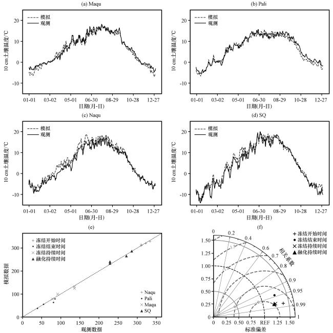 图2 2012年Naqu (a)、 2016 -2017年Pali (b)、 2009 -2010年Maqu (c)、 2017年SQ(d)的模拟和观测的土壤温度变化以及模拟冻结开始时间、 冻结结束时间、 冻结持续时间、 融化持续时间与0.1 m土壤深度原位观测分析(e)和泰勒图(f)(f)泰勒图中灰色虚线为标准化的中心化均方根误差 Fig.2 Simulated and observed soil temperature variations at Naqu in 2012 (a), Pali from 2016 to 2017 (b), Maqu from 2009 to 2010 (c), and SQ in 2017 (d), along with the analysis of simulated freeze start time, freeze end time, freeze duration, thaw duration, and in-situ observations at 0.1 m soil depth (e), and Taylor diagram (f).In the Taylor diagram (f), the gray dashed line represents the normalized centered root-mean-square error |