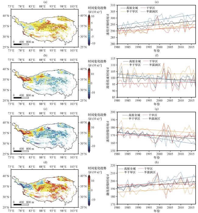 图4 1980 -2017年高原多年冻土区域冻结开始时间(a)、 冻结结束时间(b)、 冻结持续时间(c)、 融化持续时间(d)变化趋势空间分布(左)以及冻结开始时间(e)、 冻结结束时间(f)、 冻结持续时间(g)、 融化持续时间(h)时间序列及变化趋势(右)打点区域为通过90%信度检验 Fig.4 Spatial distribution of trends(left) in freeze start time (a), freeze end time (b), freeze duration (c), and thaw duration (d) in the permafrost regions of the plateau from 1980 to 2017, as well as time series and trends (right)of freeze start time (e), freeze end time (f), freeze duration (g), and thaw duration (h).Dotted areas indicate regions that passed the 90% confidence level test |