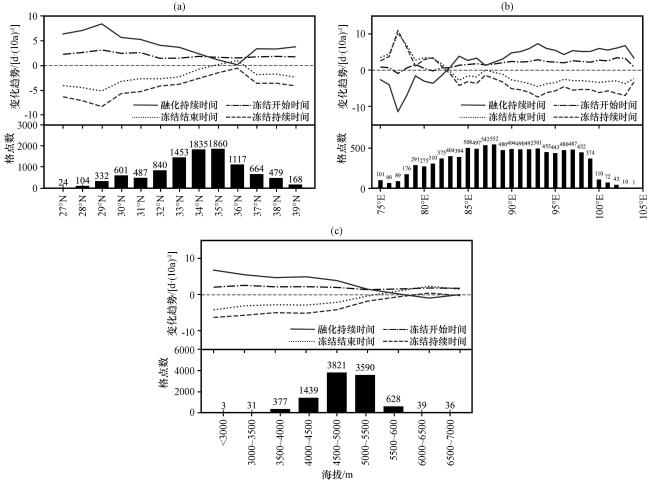 图5 冻结开始时间(点实线)、 冻结结束时间(点线)、 冻结持续时间(虚线)、 融化持续时间(实线)与地理因子的关系黑色柱状为格点数量(单位: 个) Fig.5 Relationships between freeze start time (dotted solid line), freeze end time (dotted line), freeze duration (dashed line), thaw duration (solid line), and geographic factors.The black bars represent the number of grid points (unit: count) |