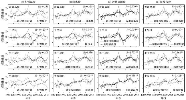 图7 1980 -2017年高原多年冻土不同气候分区土壤融化持续时间与积雪厚度(a)、 降水量(b)、 近地表温度(c)和植被指数(1982 -2015年)(d)的时间序列所有变量均进行标准化处理, 粗线条为滑动平均序列, R为相关系数, 其中*为通过90%的信度检验, **为通过99%的信度检验 Fig.7 Time series of soil thaw duration and snow depth (a), precipitation (b), near-surface temperature (c), and vegetation index (1982-2015) (d) in different climatic subregions of the plateau permafrost from 1980 to 2017.All variables are standardized, and the thick lines represent the moving average sequences.R is the correlation coefficient, where * indicates passing the 90% confidence level test, and ** indicates passing the 99% confidence level test |