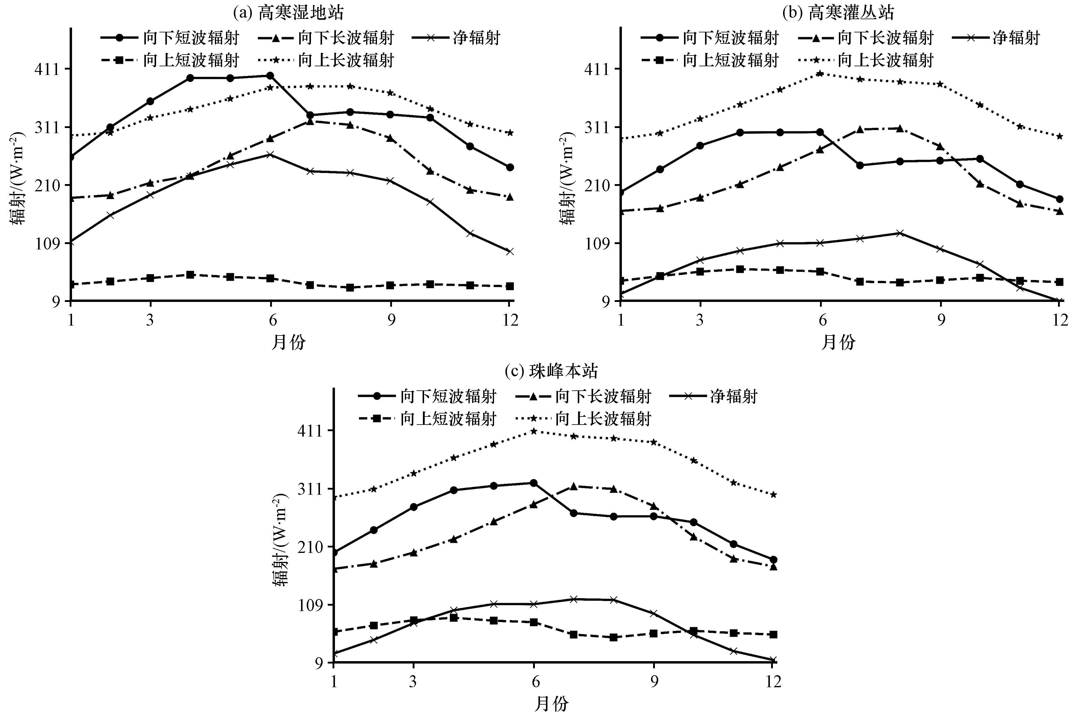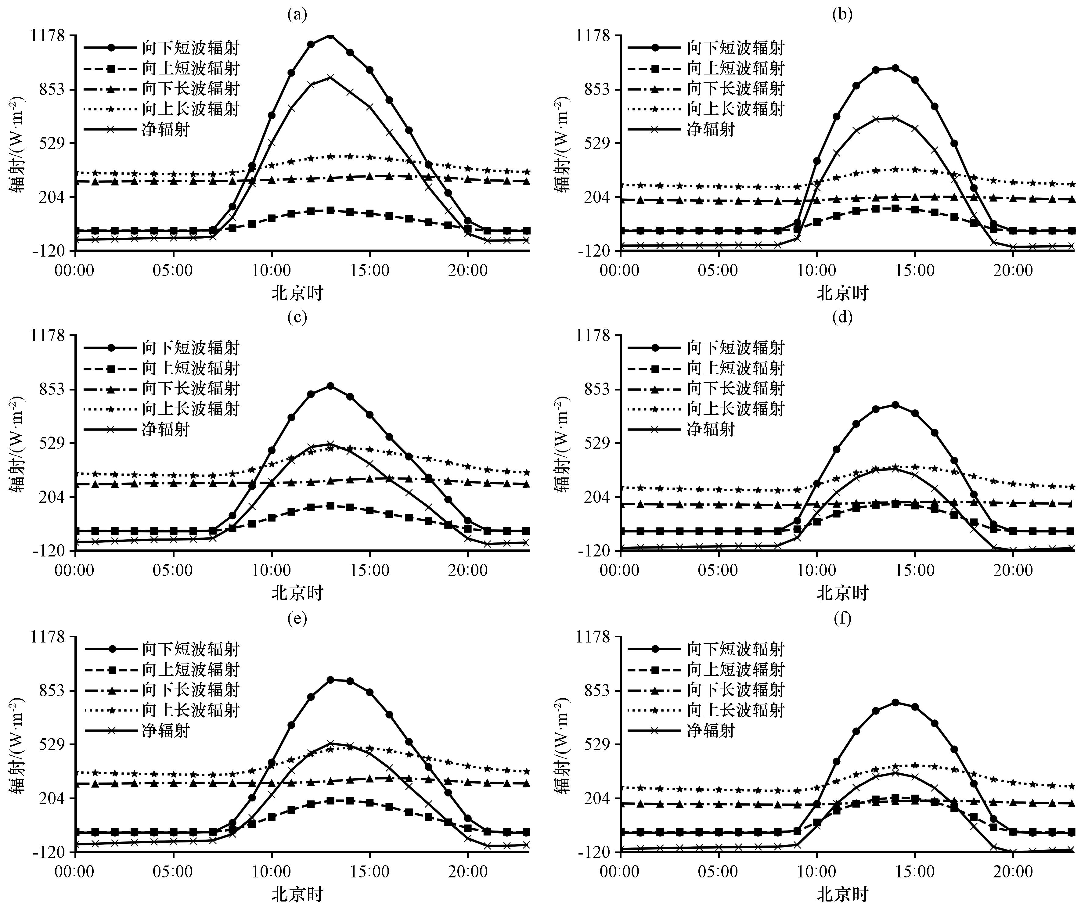 图6 辐射通量多年夏季(a, b, c)、 冬季(d, e, f)日平均变化图(a)、 (d)高寒湿地站, (b)、 (e)高寒灌丛站, (c)、 (f)珠峰本站 Fig.6 Annual average daily variation charts of radiation flux for summer(a, b, c) and winter(d, e, f).(a)、 (d) High-altitude Wetland Station, (b)、 (e) High-altitude Cold Bush Station, (c)、 (f) Mount Everest Station |