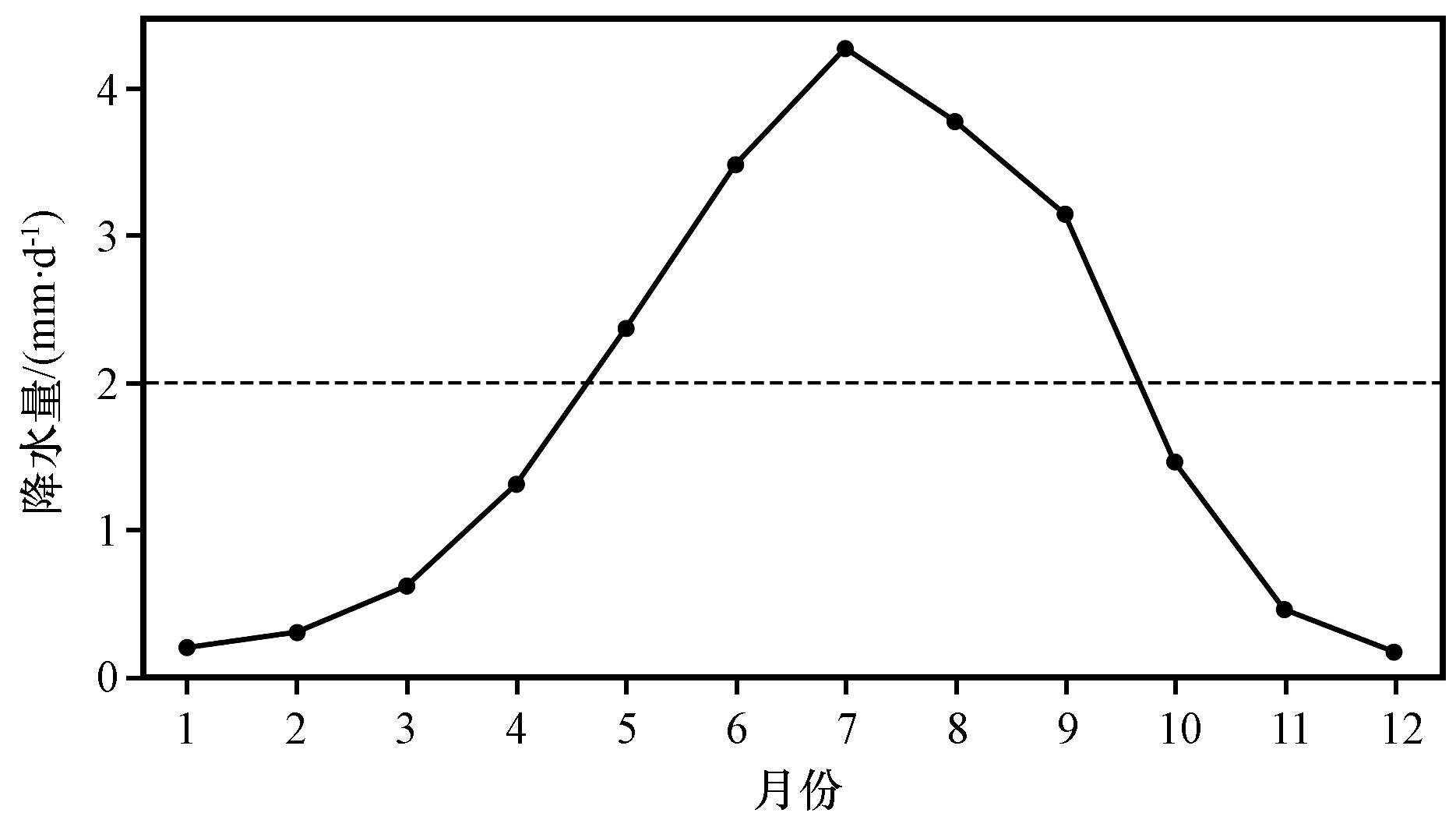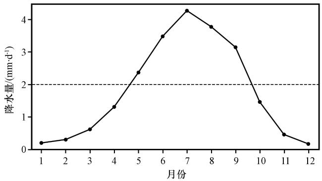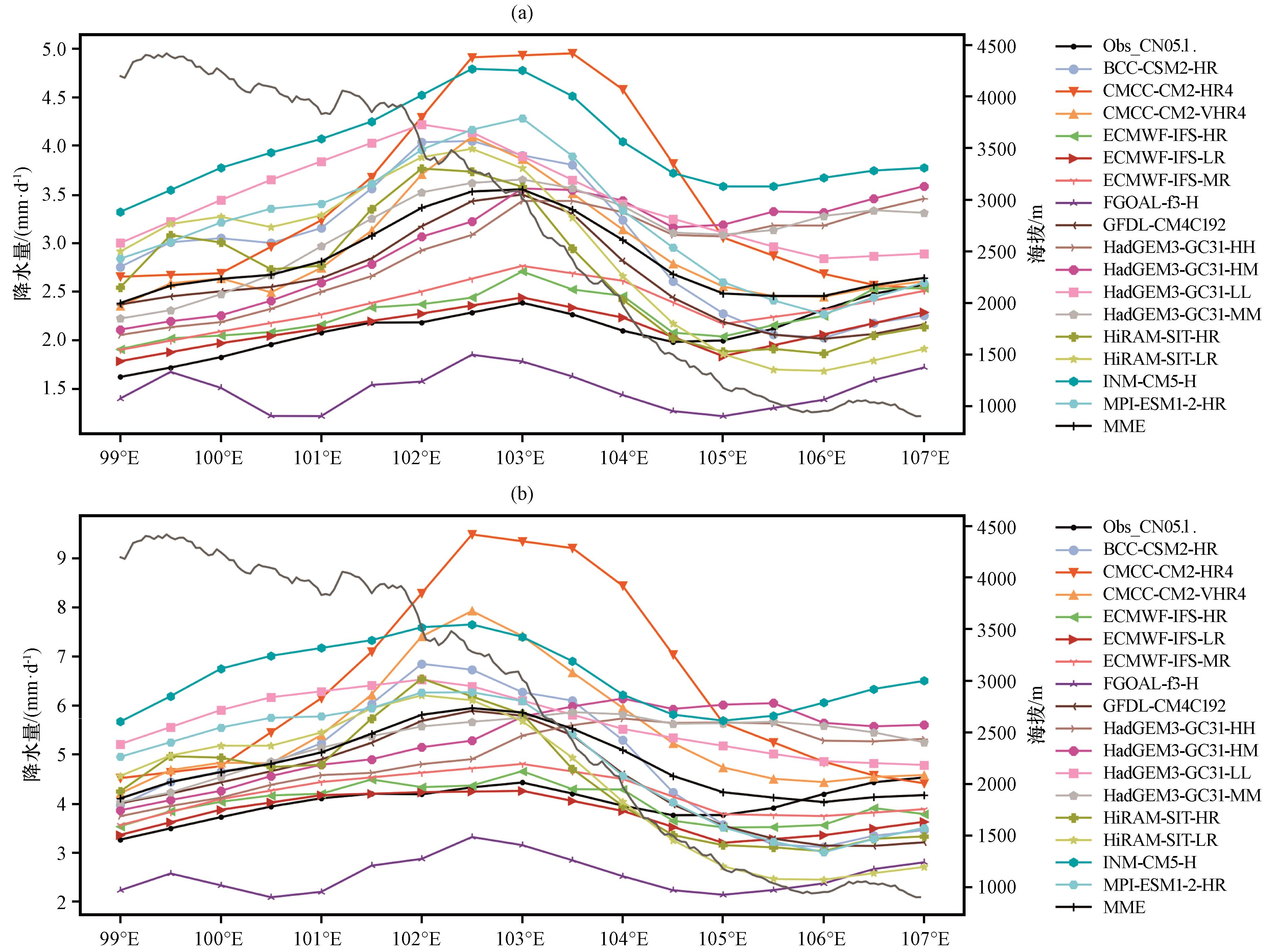 图8 1995 -2014年青藏高原东坡年平均降水(a)和暖季降水(b)经向平均剖面图(单位: mm·d-1)灰色实线为区域的经向平均海拔 Fig.8 Meridional mean profiles of annual mean precipitation (a) and warm season precipitation (b)over the eastern slope of the Qinghai-Xizang Plateau for 1995 -2014.The gray solid line represents the zonal average elevation of the region.Unit: mm·d-1 |