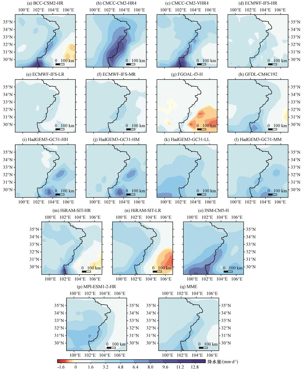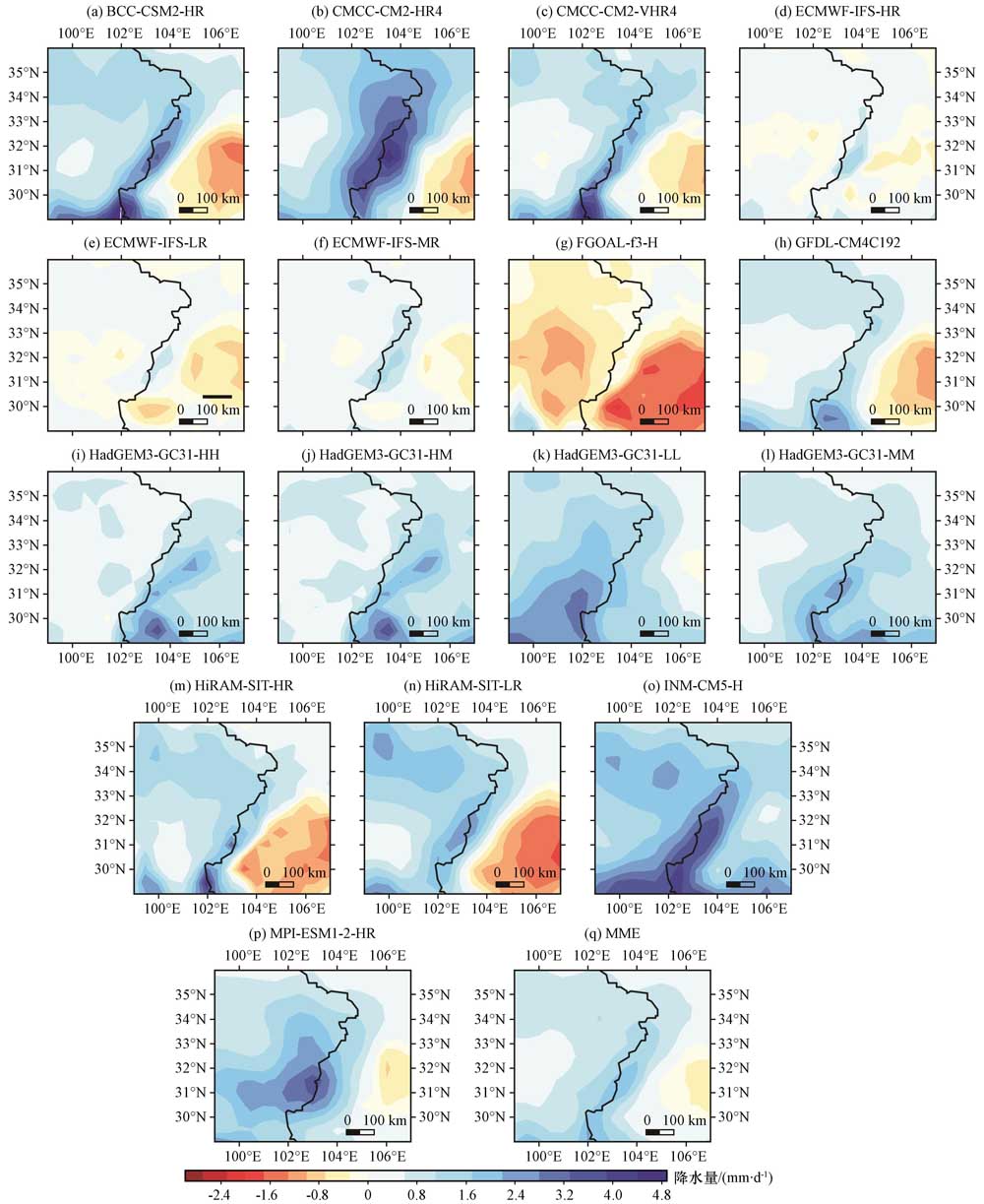 图7 1995 -2014年青藏高原东坡年平均降水的HighResMIP模式(a~p)以及多模式集合平均(q)相较于观测偏差(单位: mm·d-1)Fig.7 Annual mean precipitation biases relative to observations during 1995 -2014 over the eastern slope of the Qinghai-Xizang Plateau from HighResMIP models (a~p) and multi-model ensemble mean (q).Unit: mm·d-1 |