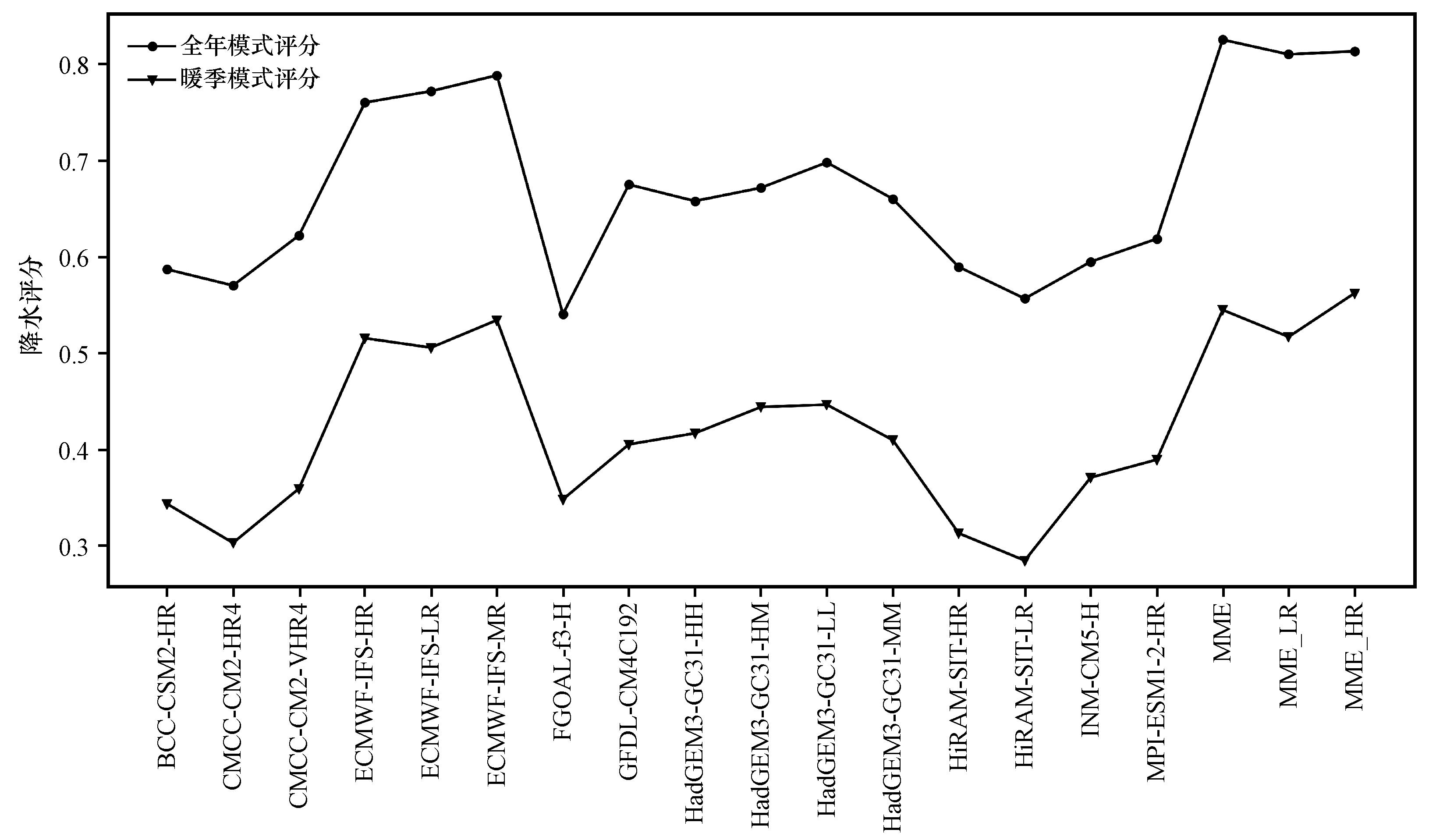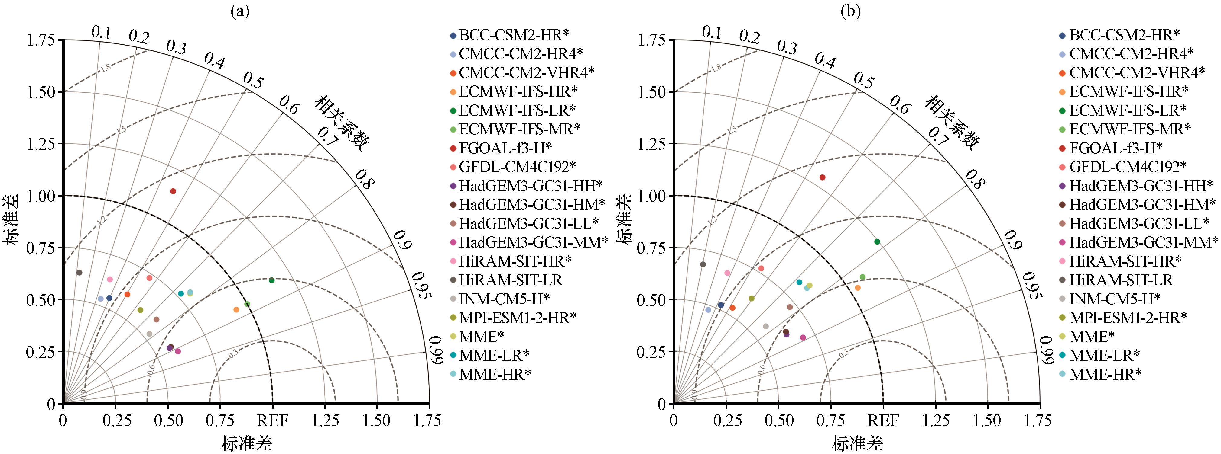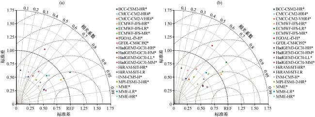 图11 青藏高原东坡 HighResMIP各模式和CN05.1观测数据年平均(a)和暖季降水(b)空间分布泰勒图*表示相关系数通过了95%显著性检验 Fig.11 Taylor diagrams for the spatial distribution of precipitation over the eastern slope of the Qinghai-Xizang Plateau comparing HighResMIP models with CN05.1 observations for annual mean(a) and warm season precipitation(b).An asterisk (*) indicates that the correlation coefficient has passed the 95% significance test |