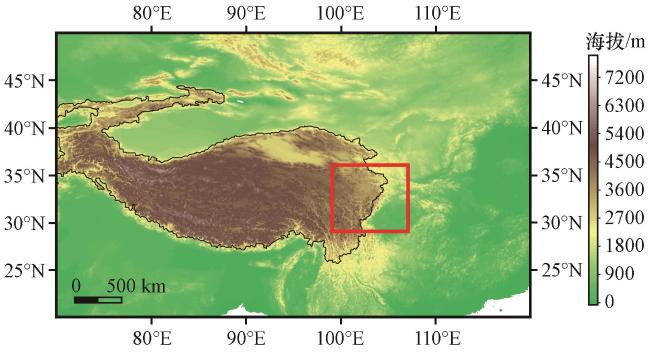 图1 青藏高原东坡范围和地形高度图红色框区域为青藏高原东坡(下同), 黑色等值线区域为青藏高原2500 m等高线 Fig.1 Terrain and elevation of the eastern slope of the Qinghai-Xizang Plateau.The red box area represents the eastern slope of the Qinghai-Xizang Plateau (the same as after), while the black contour line indicates the 2500-meter elevation contour of the Qinghai-Xizang Plateau |