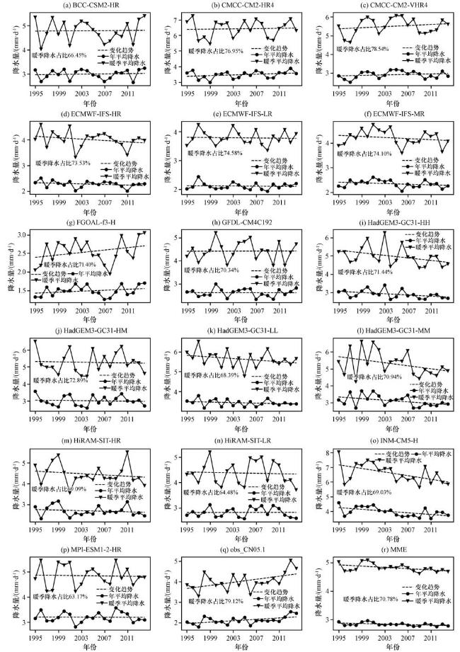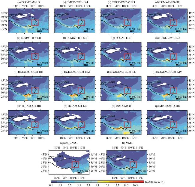 图4 HighResMIP模式(a)~(p)、 观测数据(q)以及多模式集合平均(r)1995 -2014年暖季平均降水分布(单位: mm·d-1)Fig.4 The warm-season monthly mean precipitation distribution from HighResMIP models (a)~(p), observational data (q), and the multi-model ensemble mean (r) over 1995 -2014.Unit: mm·d-1 |