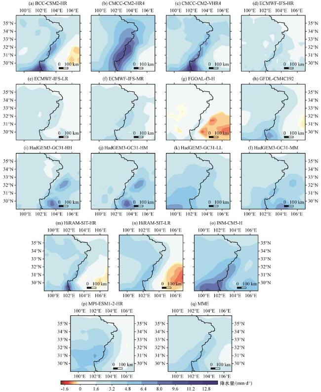 图6 1995 -2014年青藏高原东坡暖季平均降水的HighResMIP模式(a~p)以及多模式集合平均(q)相较于观测偏差(单位: mm·d-1)Fig.6 Warm-season mean precipitation biases relative to observations during 1995 -2014 over the eastern slope of the Qinghai-Xizang Plateau from HighResMIP models (a~p) and multi-model ensemble mean (q).Unit: mm·d-1 |