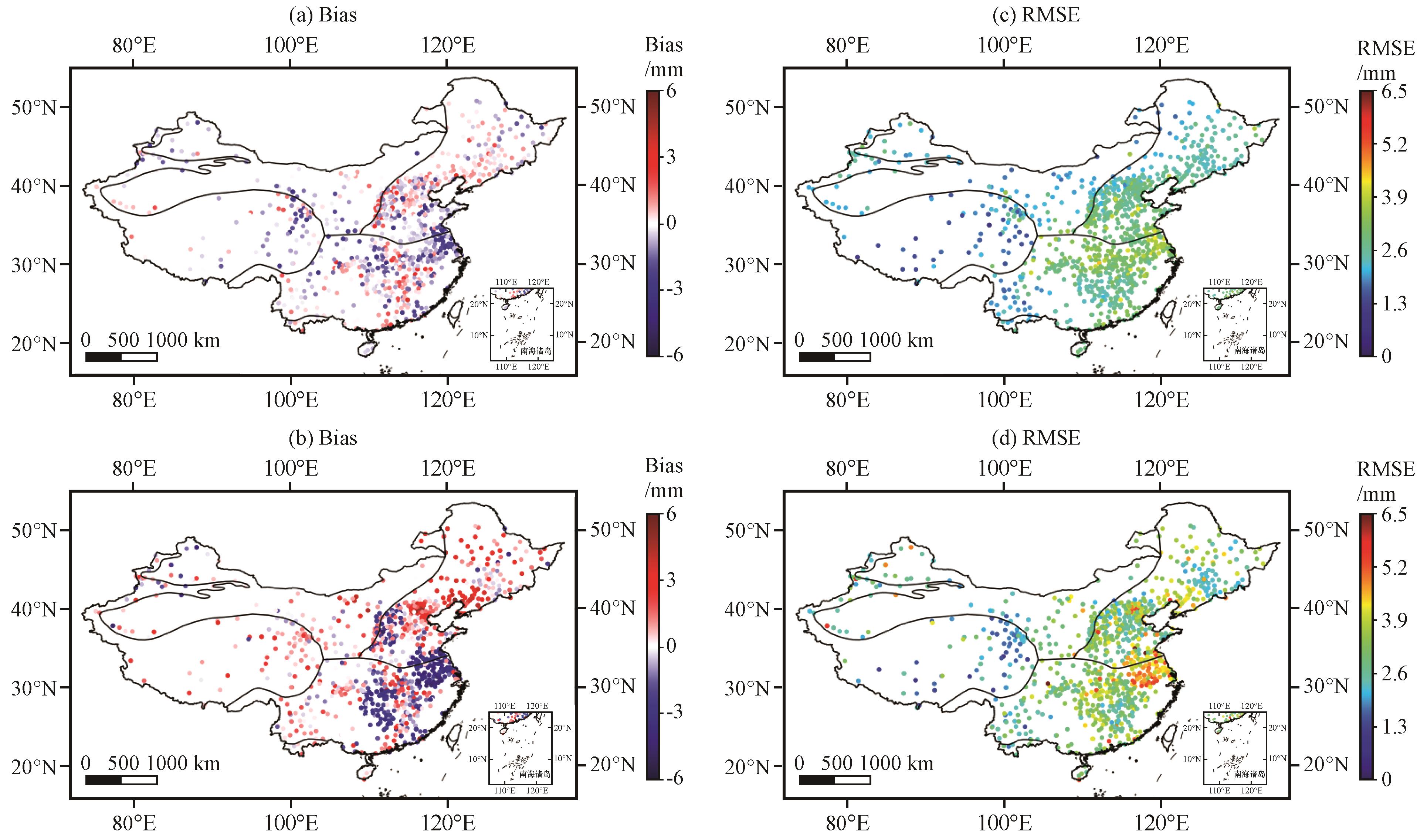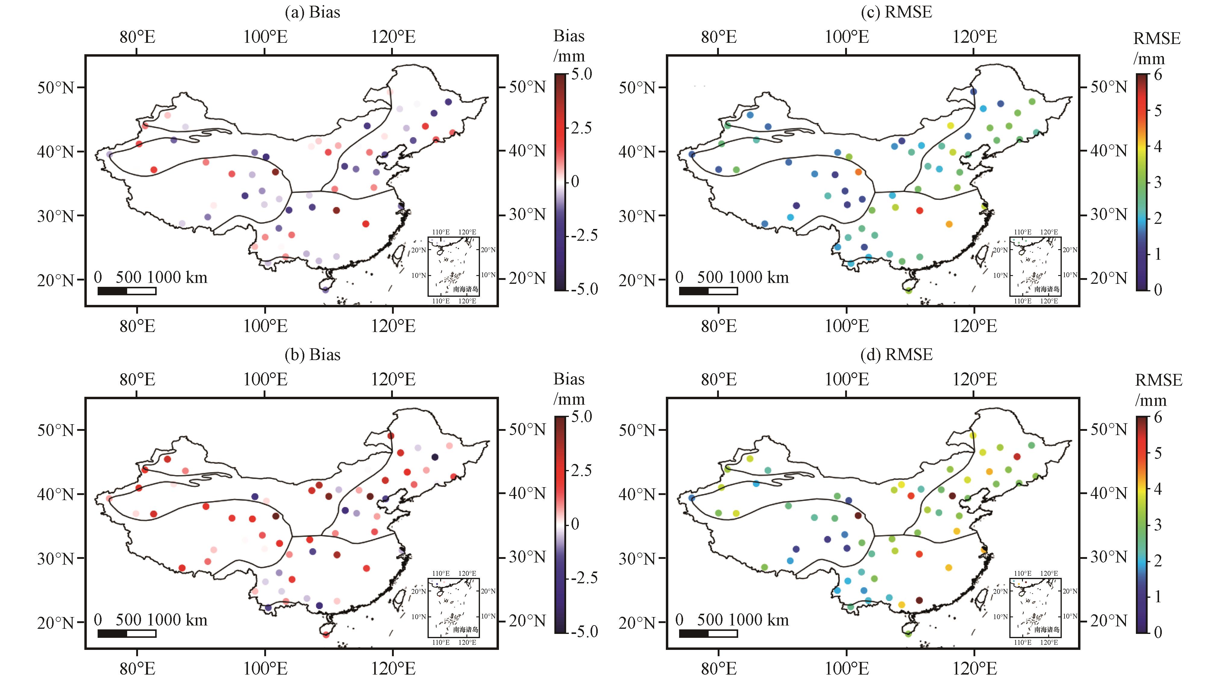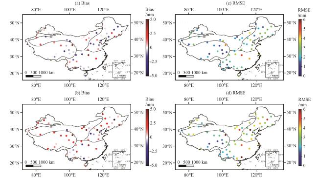 图4 GNSS-PWV与RS-PWV的Bias(单位:mm)、 RMSE(单位:mm)区域分布(a)、 (c)双差解与探空资料的对比结果, (b)、 (d)PPP解与探空资料的对比结果 Fig.4 Bias (unit:mm) and RMSE (unit:mm) regional distribution of GNSS-PWV and RS-PWV.(a), (c) the comparison results between double-difference network solution and radiosonde data, (b), (d) the comparison results between PPP solution and radiosonde data |