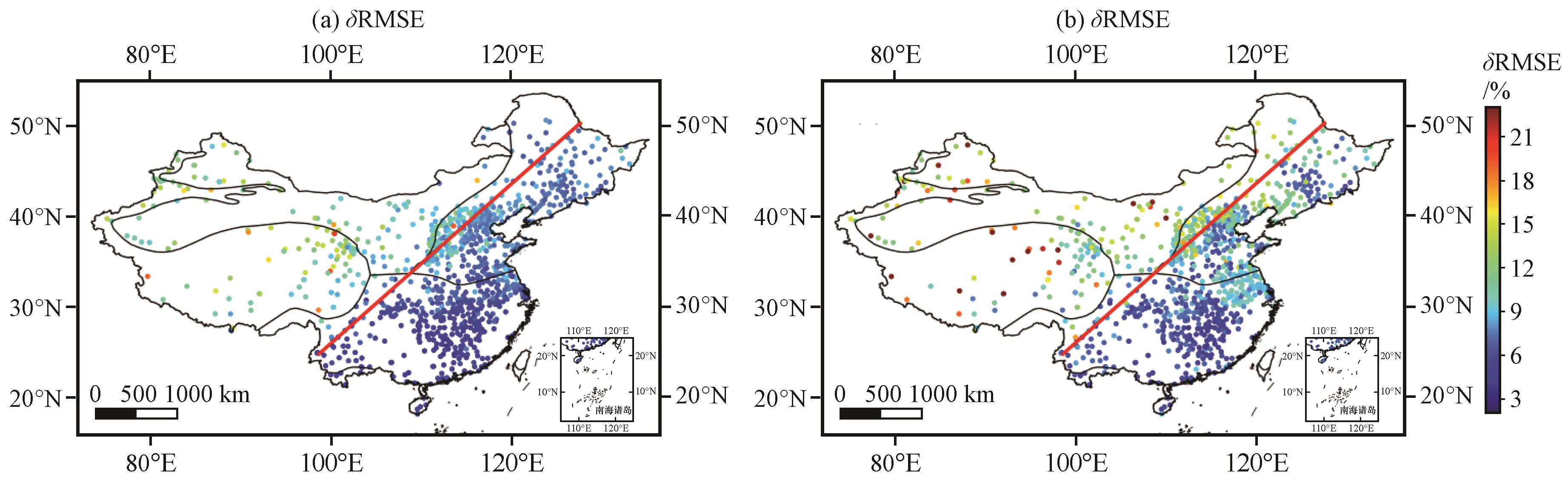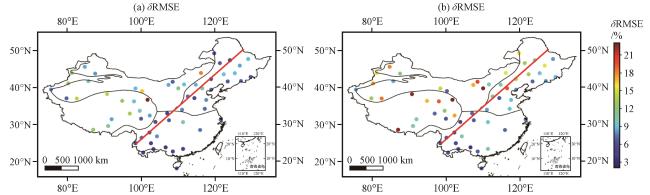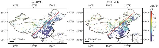 图8 GNSS-PWV与RS-PWV的δRMSE区域分布(单位:%)(a)双差解与探空资料的对比结果, (b)PPP解与探空资料的对比结果 Fig.8 Regional distribution of δ RMSE between GNSS-PWV and RS-PWV.Unit: %.(a)the comparison between double-difference network solution and radiosonde data, (b)the comparison between PPP solution and radiosonde data |