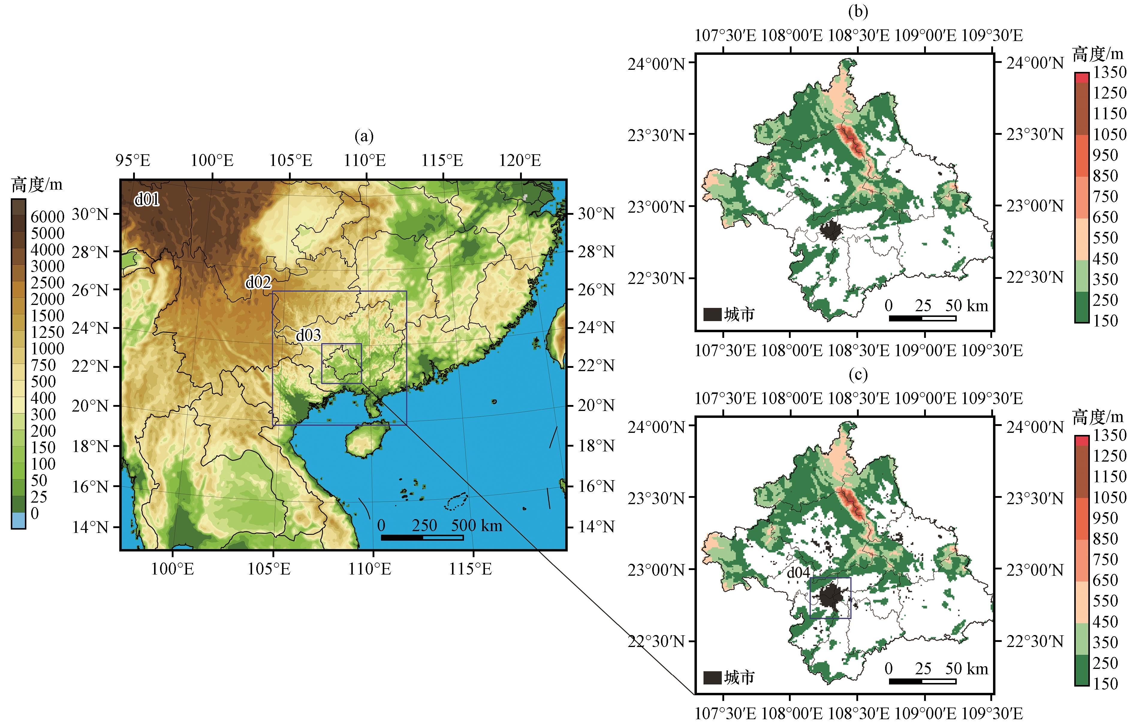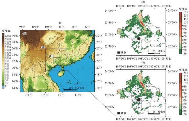 图2 WRF模式嵌套区域范围及海拔分布(a, 单位: m), 南宁市海拔(单位: m)及2000年(b)和2020年(c) do3区域城市地表分布图(c)中d04区域为南宁主城区 Fig.2 Nested region coordinates range and altitude distribution of the WRF model (a, unit: m), altitude distribution (unit: m) and urban ground at Nanning City in d03 area in 2000 (b) and 2020 (c).In Fig.(c), d04 area is the urban area of Nanning |