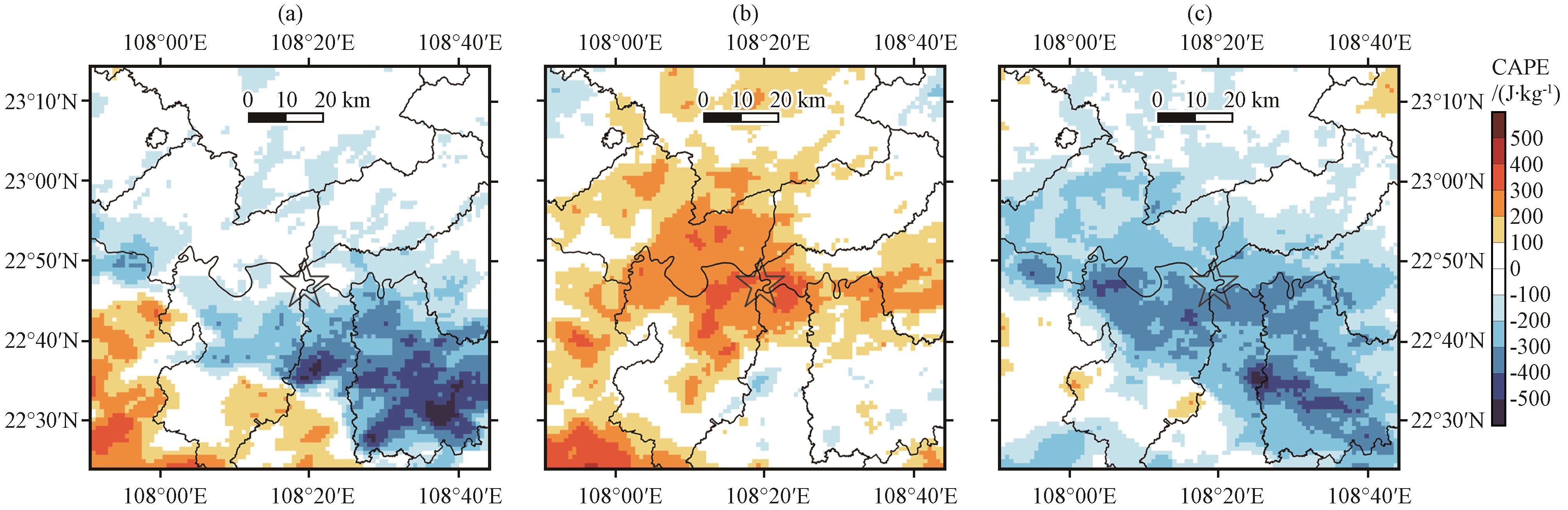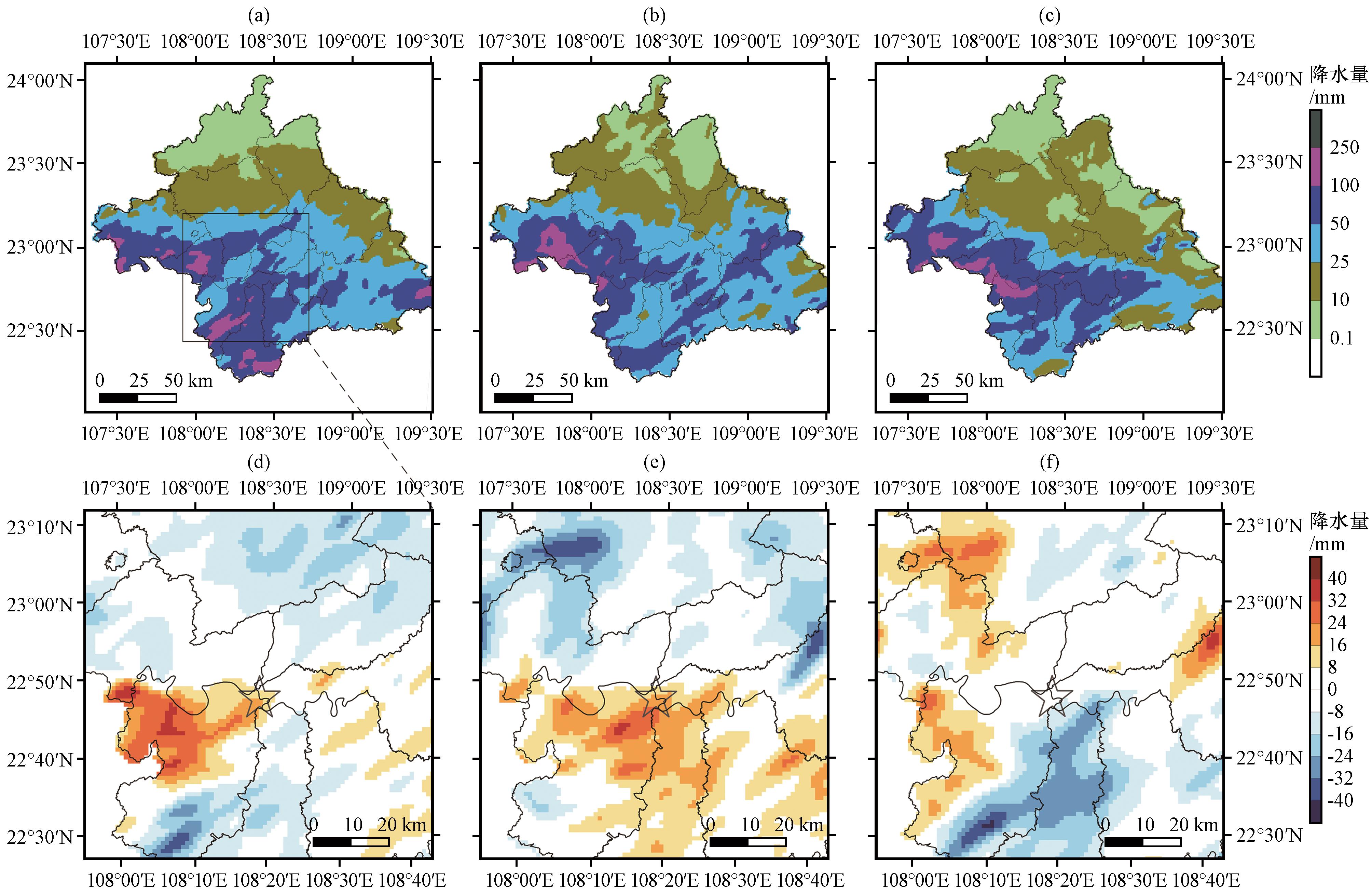 图3 各组试验方案模拟得到的5月12日03:00 -09:00累计降雨量和差值(单位: mm)(a)Old, (b)New, (c)UCM, (d)UCM与Old相减, (e)UCM与New相减, (f)New与Old相减; 五角星的位置为南宁城区中心22.8°N, 108.3°E Fig.3 Accumulated precipitation and difference from 03:00 to 09:00 on May 12th (unit: mm)(a) Old; (b) New; (c) UCM; (d) UCM.minus.Old; (e) UCM.minus.New; (f) New.minus.Old.The location of the star is the center of Nanning urban, 22.8°N, 108.3°E |
