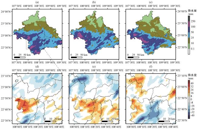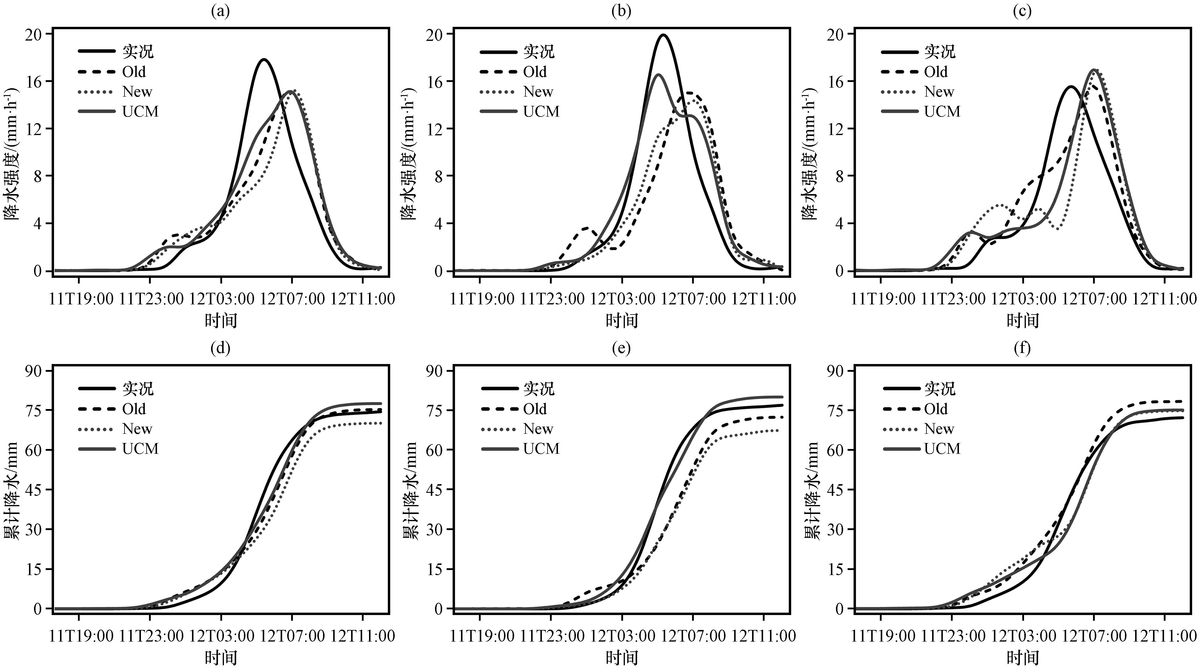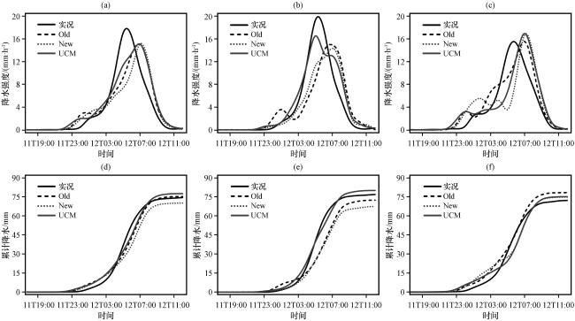 图4 5月11日17:00至12日12:00南宁城市降水强度(a~c)和累计降水(d~f)演变(a, d)主城区和郊区, (b, e)主城区(d04), (c, f)郊区 Fig.4 The evolution of precipitation rate (a~c) and accumulated precipitation (d~f) in Nanning city from 11:00 on May 11th to 11:00 on May 12th.(a, d) Urban and suburban, (b, e) Urban (d04 area), (c, f) Suburban |