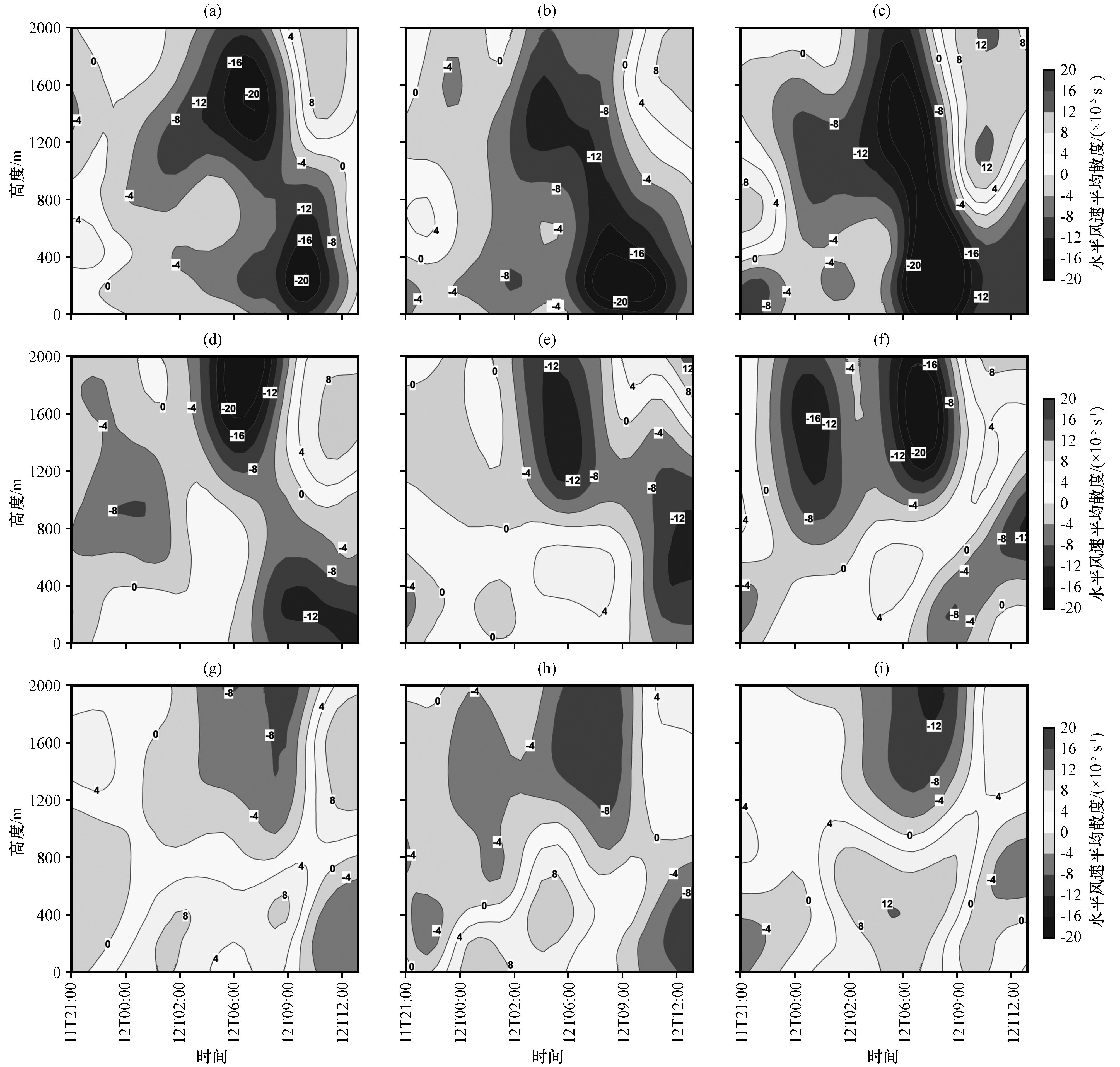图8 5月11日21:00至12日12:00南宁城市(a~c)下风区、 (d~f)主城区、 (g~i)上风区的水平风速平均散度时空变化(单位: ×10-5 s-1)(a, d, g) Old, (b, e, h) New, (c, f, i) UCM Fig.8 The average divergence of horizontal wind speed (unit: ×10-5 s-1) in the downwind (a~c), urban (d~f), and upwind (g~i) of Nanning city from 21:00 on May 11th to 12:00 on May 12th.(a, d, g) Old, (b, e, h) New, (c, f, i) UCM |