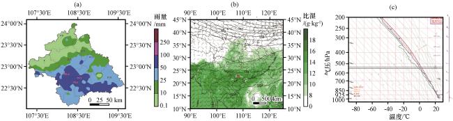 图1 2022年5月12日03:00 -09:00南宁市6 h累计雨量(a, 单位: mm), 5月11日20:00的500 hPa位势高度场(黑线, 单位: dagpm)和700 hPa垂直速度(白线, 单位: Pa·s-1)、 850 hPa风场(凤羽, 单位: m·s-1)和比湿(填色, 单位: g·kg-1)(b)以及5月11日20:00南宁站探空资料(c)图(b)中红点位置为南宁 Fig.1 6 h accumulated precipitation in Nanning from 03:00 to 09:00 on May 12th (a, unit: mm), 500 hPa geopotential height field (black line, unit: dagpm) and 700 hPa vertical velocity (white line, unit: Pa·s-1), 850 hPa wind field (windbarb, unit: m·s-1) and specific humidity (contour filling, unit: g·kg-1) at 20:00 on May 11, 2022 (b), and sounding data at Nanning station at 20:00 on May 11, 2022 (c).In Fig.1(b), the location of the red dot is Nanning |