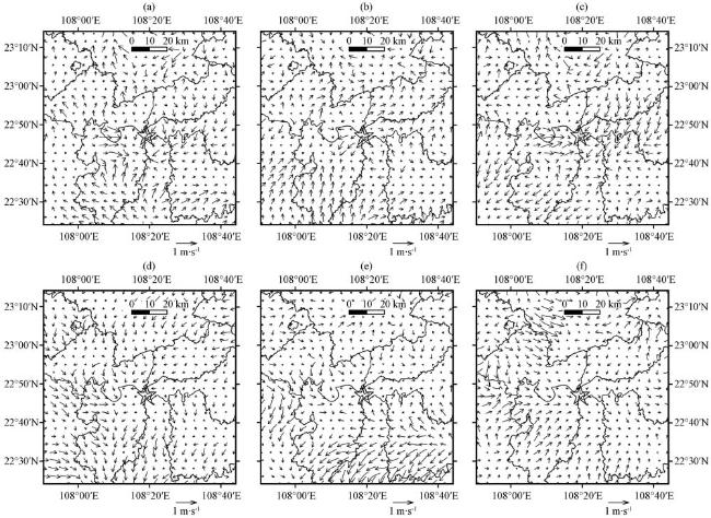 图7 10 m平均风场差异(单位: m·s-1)降水前期(a~c)和降水发展阶段(d~f)(a, d)UCM与Old相减, (b, e)UCM与New相减, (c, f)New与Old相减 Fig.7 Average wind field at 10 meters (unit: m·s-1) during the early stage (a~c) and the development stage (d~f) of rainfall periods.(a, d) UCM minus Old, (b, e) UCM minus New; (c, f) New minus Old |