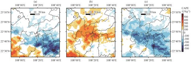 表1 各组试验方案模拟的5月11日17:00至12日12:00的南宁城市降水峰值和累计雨量与实况观测对比Table 1 The comparison of the precipitation peaks and cumulative rainfall simulated by each experimental scheme with observations in Nanning City from May 11, 17:00 to May 12, 12:00 |