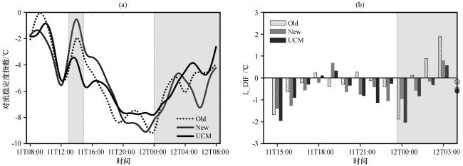 图11 5月11日08:00至12日08:00的对流稳定度指数(Ic, 单位: ℃)(a)时间序列(d04区域); (b)城区与郊区相减(圆圈代表平均值; 阴影部分为降雨时段) Fig.11 Convection stability index from 08:00 on May 11th to 08:00 on May 12th.(Ic, unit: ℃).(a) Time series (d04 area); (b) Urban minus Suburban (circles represent the average value, and shaded represent rainfall periods) |