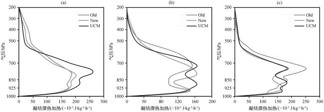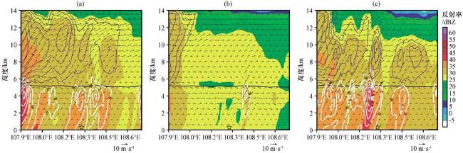 图13 5月12日05:00组合反射率(单位: dBZ)、 u、 w×10合成风(单位: m·s-1)、 液态与冰相粒子混合比(单位: g·kg-1; 白线表示液相物, 蓝线表示冰相物, 黑线为0 ℃层高度)通过(22.8°N, 108.3°E)的垂直剖面(a)Old, (b)New, (c)UCM Fig.13 Vertical profiles of combined reflectivity (unit: dBZ), u, w×10 synthetic wind (unit: m·s-1), liquid and ice phase particle mixing ratio (unit: g·kg-1; white line represents liquid phase material, blue line represents ice phase material, black line is the height of the 0 ℃ layer) passing through (22.8°N, 108.3°E) at 05:00 on May 12th.(a) Old, (b) New, (c) UCM |