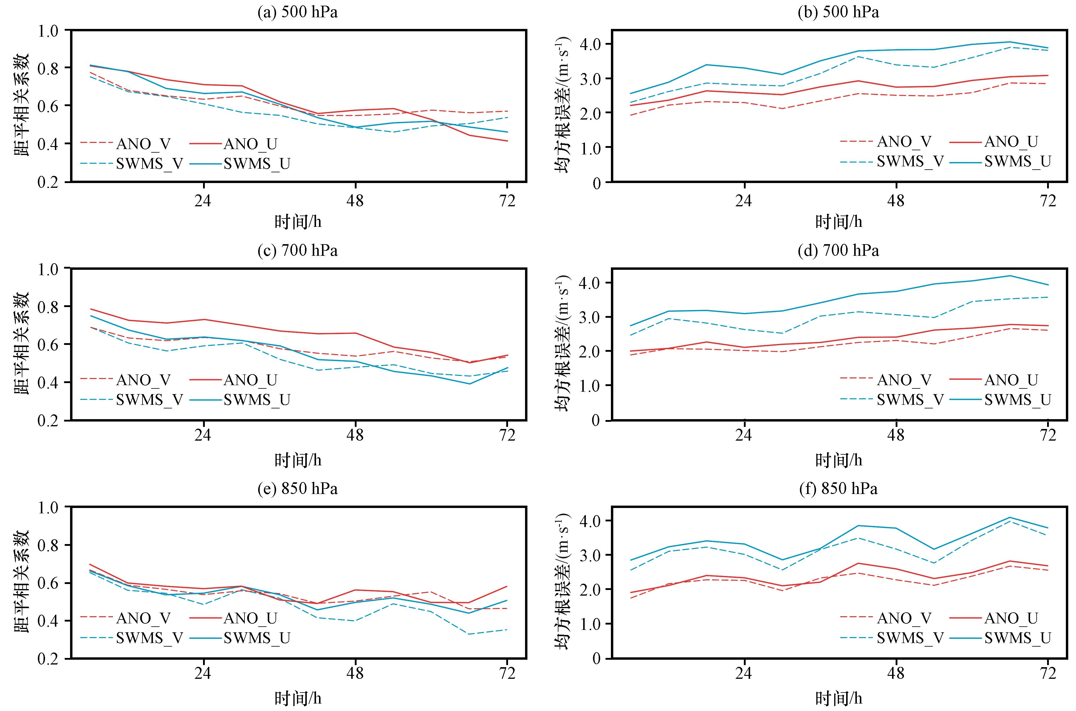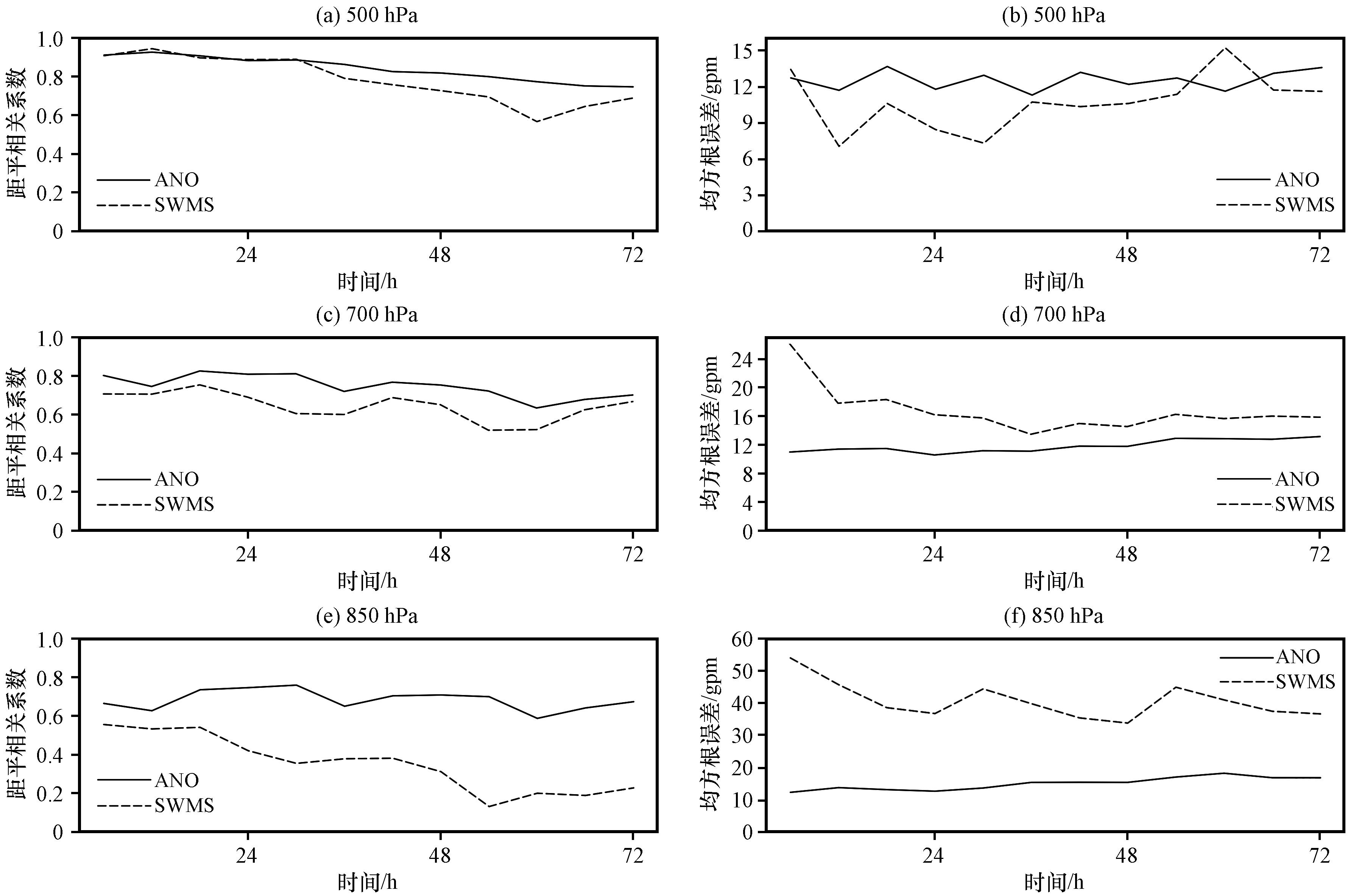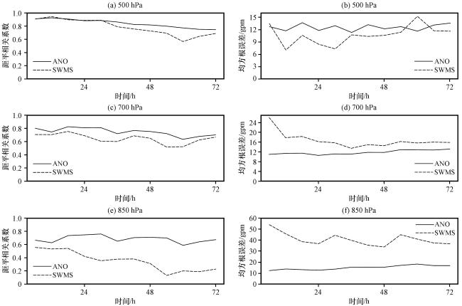图1 2019年6月20 -22日SWMS模式预报和ANO订正的500 hPa(上)、 700 hPa(中)、 850 hPa(下)位势高度场平均距平相关系数(左)和均方根误差(右, 单位: gpm)的时间演变Fig.1 Temporal evolution of the mean ACC (left) and RMSE (right, unit: gpm) for the 500 hPa (top), 700 hPa (middle), and 850 hPa (bottom) geopotential height from the SWMS model forecast and ANO correction, initiated on June 20-22, 2019 |