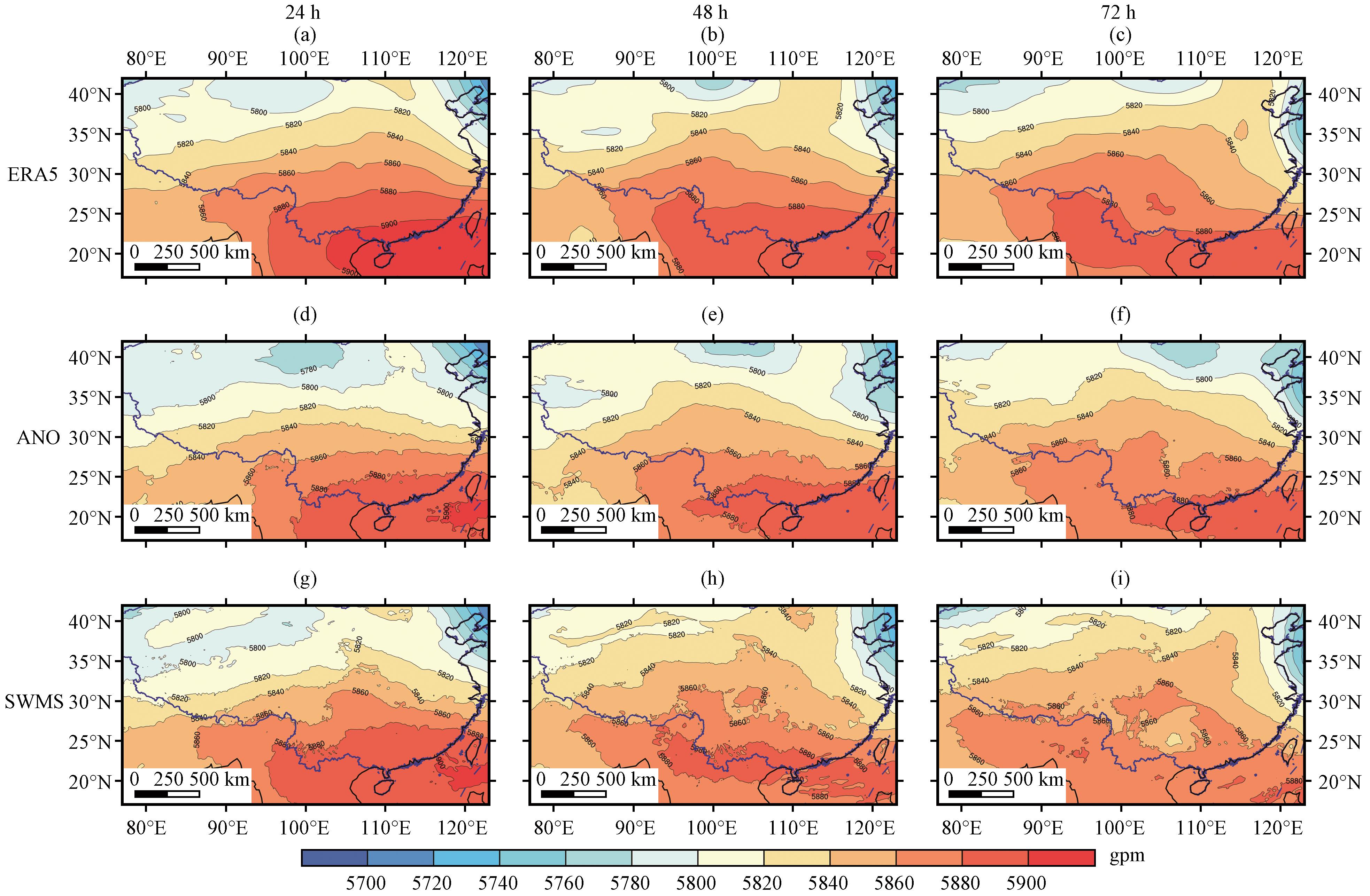 图2 2019年6月20日24 h(左)、 48 h(中)和72 h(右)500 hPa位势高度的ERA5再分析场(a、 b、 c)、 ANO订正(d、 e、 f)和SWMS模式预报(g、 h、 i)对比(单位: gpm)Fig.2 Comparison of the ERA5 reanalysis data (a, b, c), ANO correction (d, e, f), and SWMS model forecast (g, h, i) for the 500 hPa geopotential height at 24-hour (left), 48-hour (middle), and 72 hour (right) initiated on June 20, 2019.Unit: gpm |
