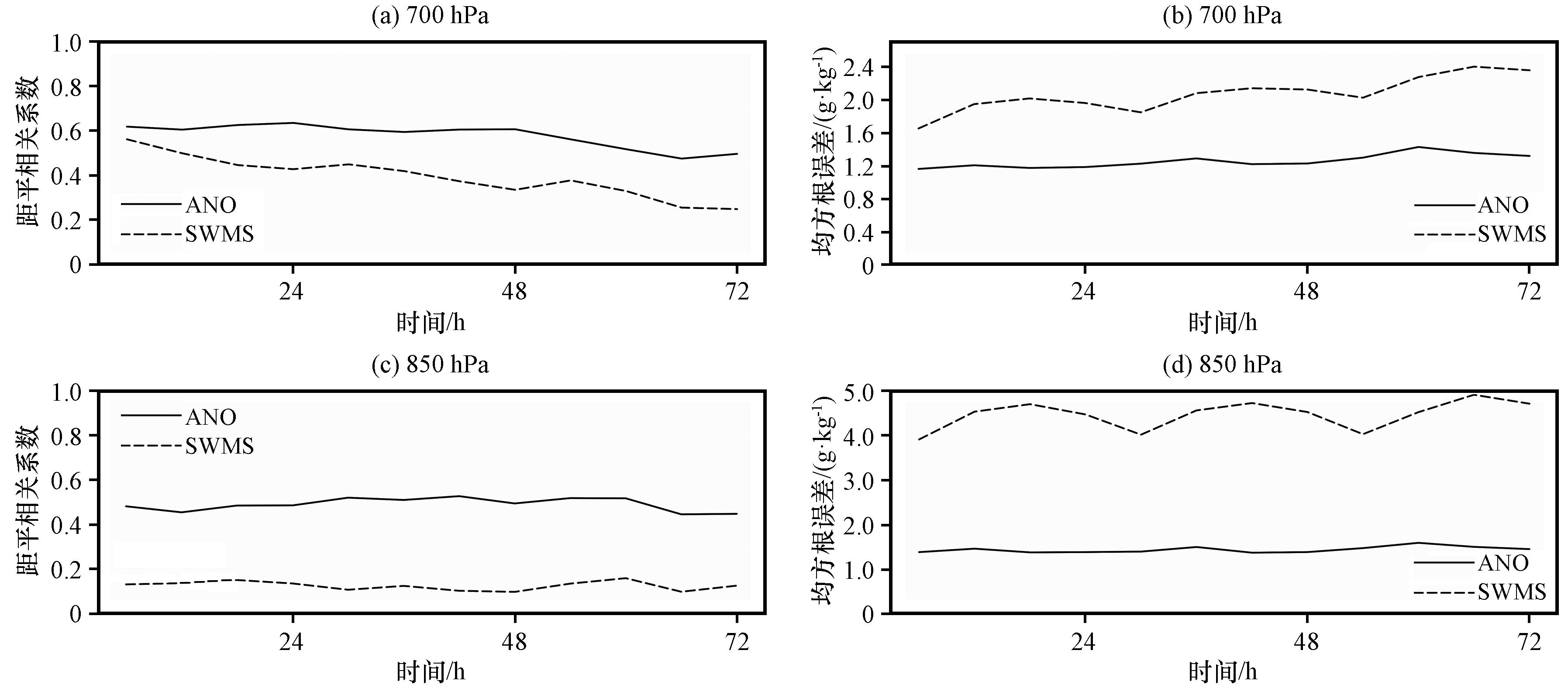 图3 2019年6月20 -22日SWMS模式预报和ANO订正的700 hPa(上)和850 hPa(下)比湿平均距平相关系数(左)、 均方根误差(右、 单位: g·kg-1)的时间演变Fig.3 Temporal evolution of the mean ACC (left) and RMSE (right, unit: g·kg-1) for the 700 hPa (top) and 850 hPa (bottom) specific humidity from the SWMS model forecast and ANO correction, initiated on June 20 -22, 2019 |