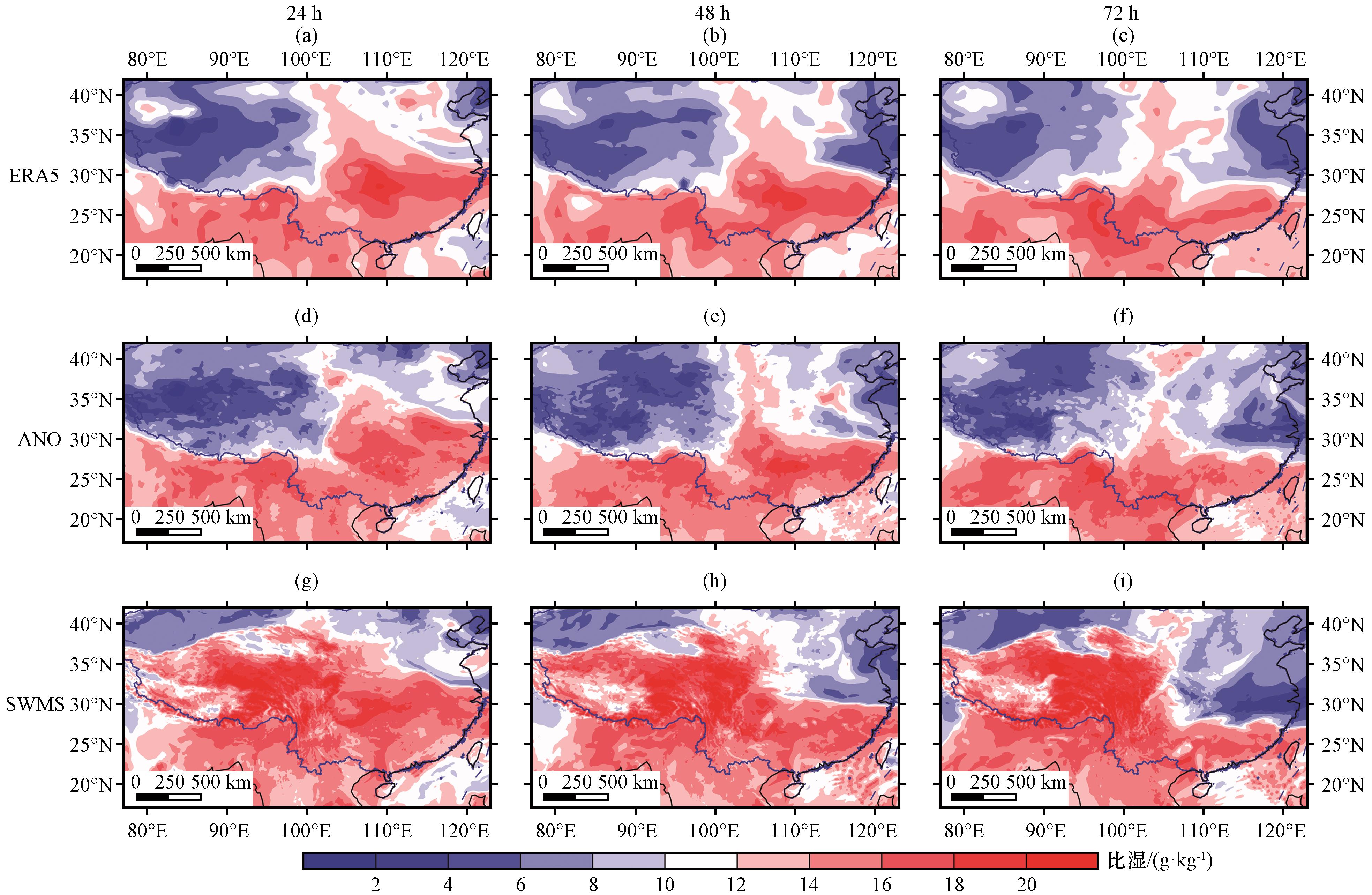 图4 2019年6月20日24 h(左)、 48 h(中)和72 h(右)850 hPa比湿的ERA5再分析场(a、 b、 c)、 ANO订正(d、 e、 f)和SWMS模式预报(g、 h、 i)对比(单位: g·kg-1)Fig.4 Comparison of the ERA5 reanalysis data (a, b, c), ANO correction (d, e, f), and SWMS model forecast (g, h, i) for the 850 hPa specific humidity (unit: g·kg-1) at 24-hour (left), 48-hour (middle), and 72-hour (right) initiated on June 20, 2019 |